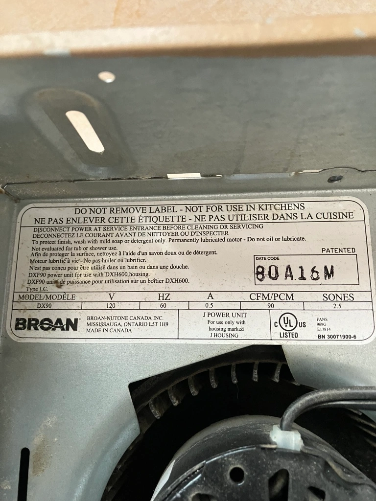 Broan Bathroom Exhaust Fan - Model DX90. Includes the fan housing, and the fan grille, but does not include any mounting brackets or electrical wiring. The exhaust vent pipe is not included. This fan does not have a light. This fan is not suitable for kitchens. The fan has a 4" exhaust connection. The fan has 3 speeds. The fan is in good condition but may show signs of use. It is sold "as is". The fan is ready for pick-up, but local delivery may be available upon request.