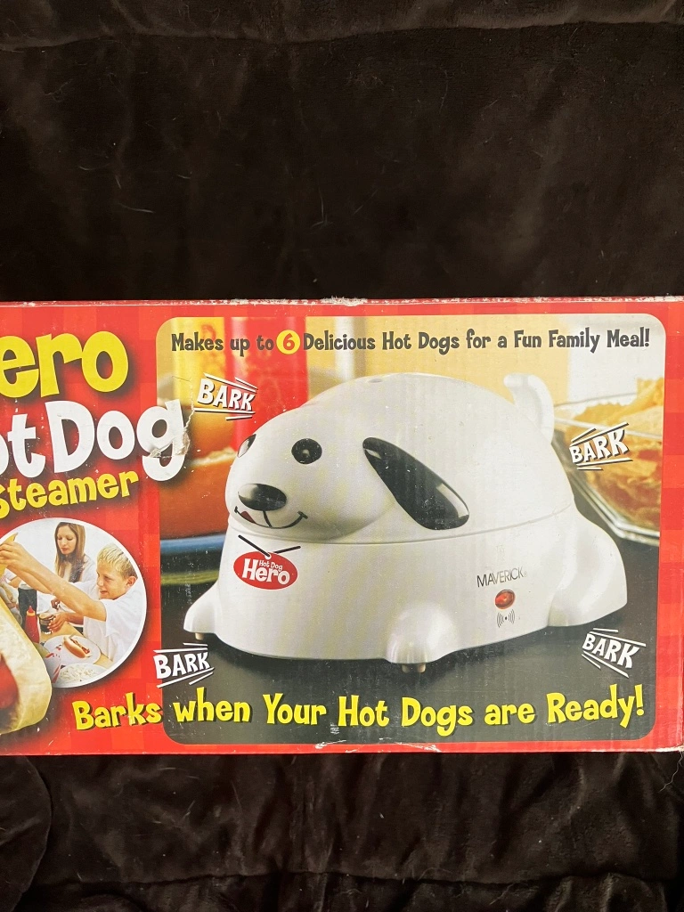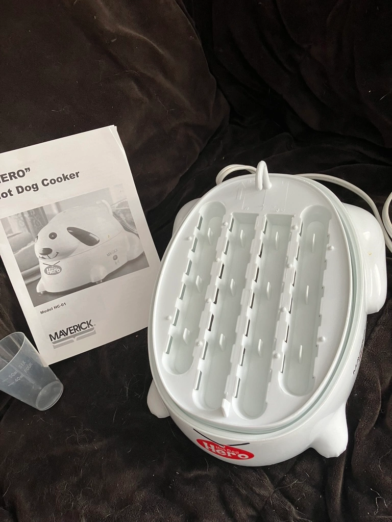 This is a Maverick Hot Dog Hero Steamer. The steamer is shaped like a dog it barks when the hotdogs are done Cook six delicious hotdogs, fun for a family meal bought it for our grandkids, but moved to BC The steamer comes with a manual, a measuring cup, It is in good condition.