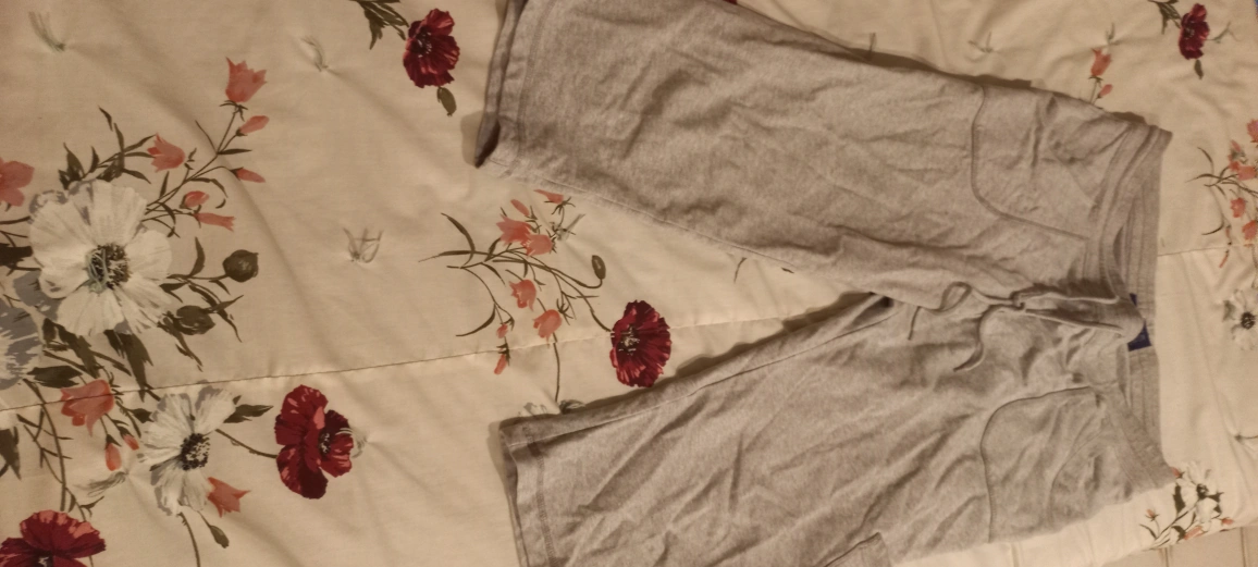 These are grey sweatpants with a drawstring waistband and two pockets. They are made of a soft and comfortable material. They are in good condition. The waist is about 32 inches and the inseam is about 30 inches. These are a great option for lounging around the house or for a casual workout.
