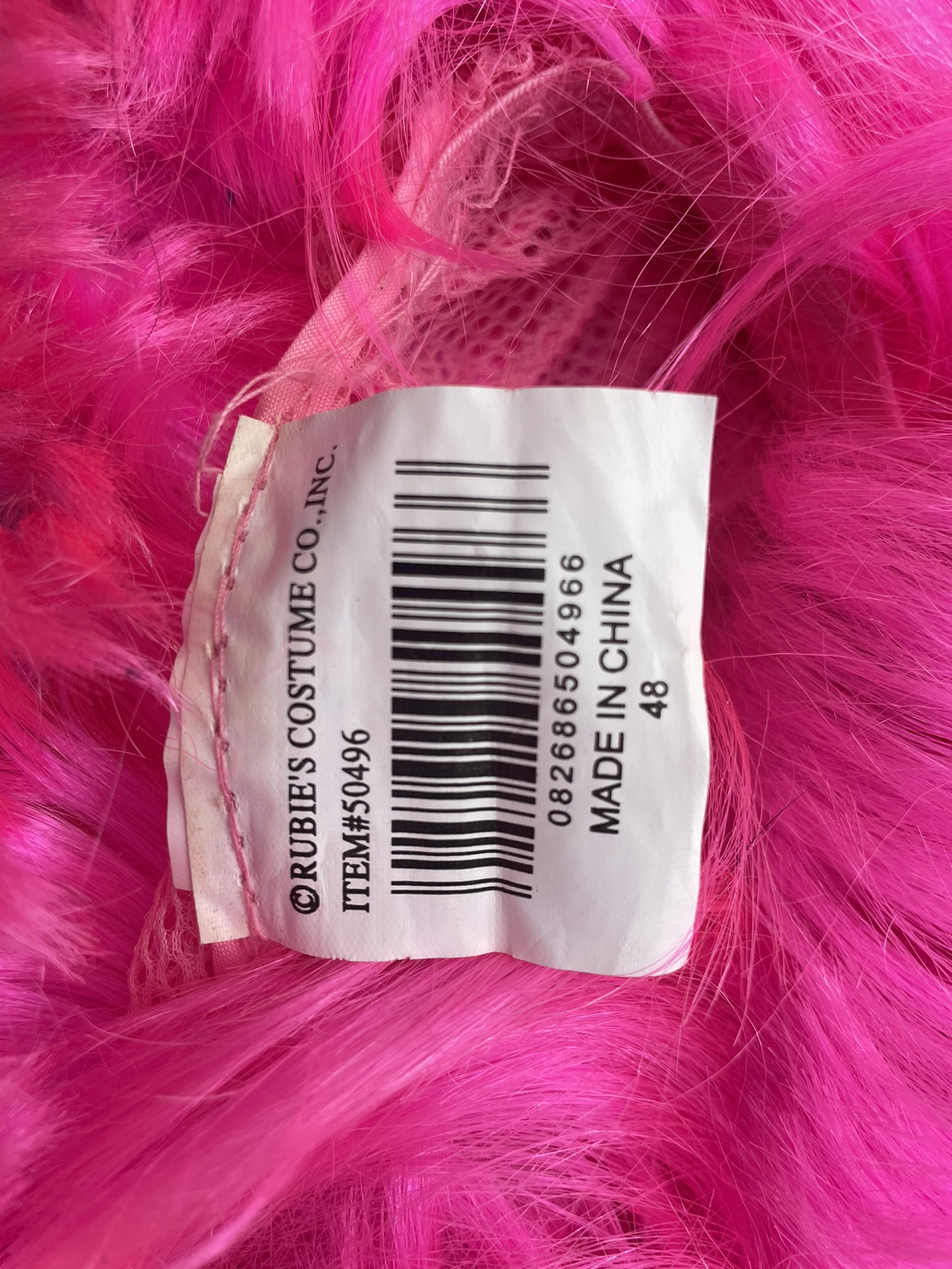 Pink wig with a net lining. It is made by Rubie's Costume Co. It is in good used condition. Wig is a small fit, might be for children.