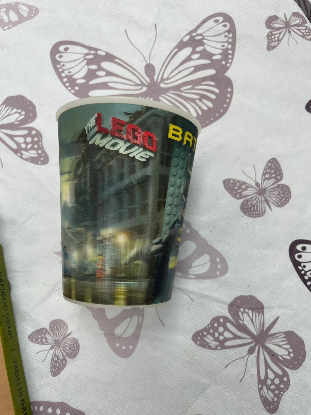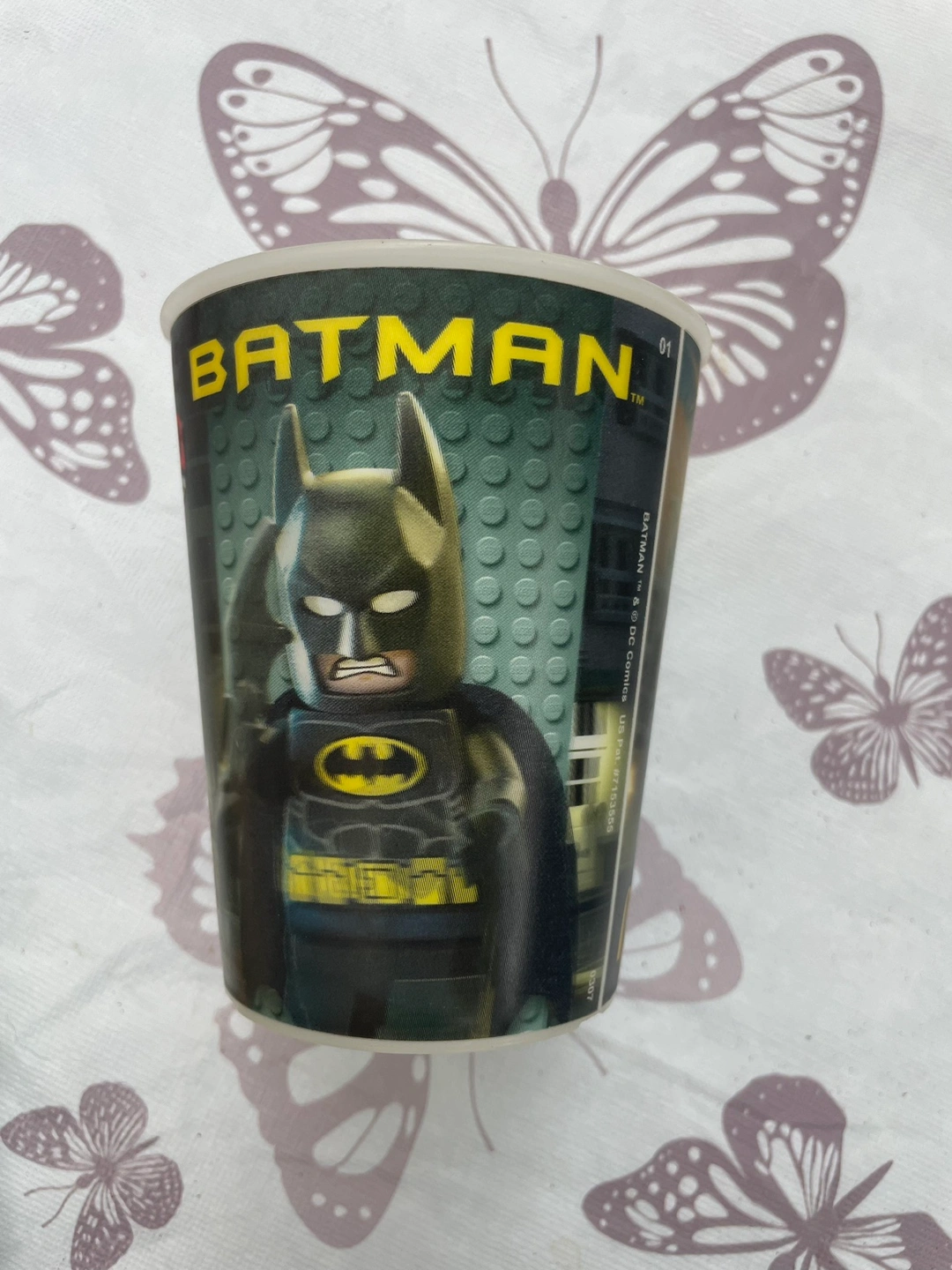 A plastic cup featuring Batman from The Lego Movie. Holographic design. Used good condition.