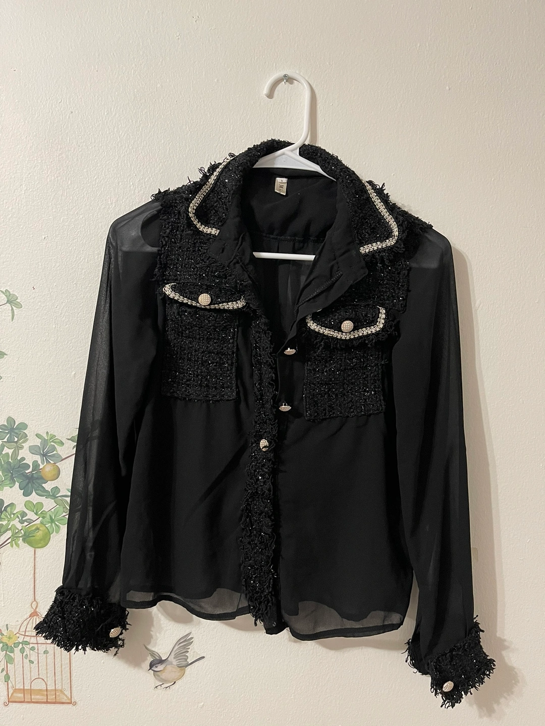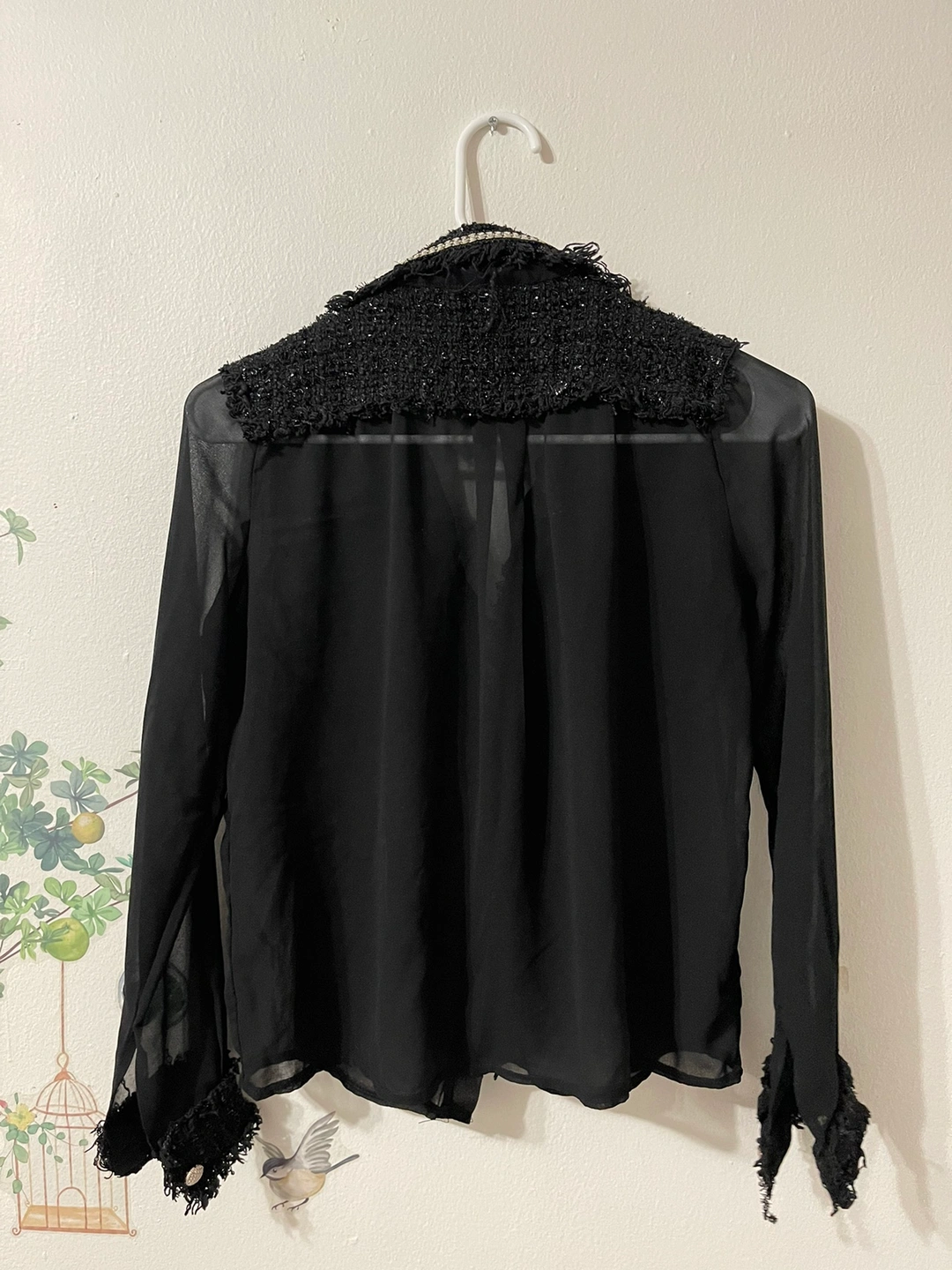 Long-sleeved black sheer blouse with fringe detail and pearl accents.