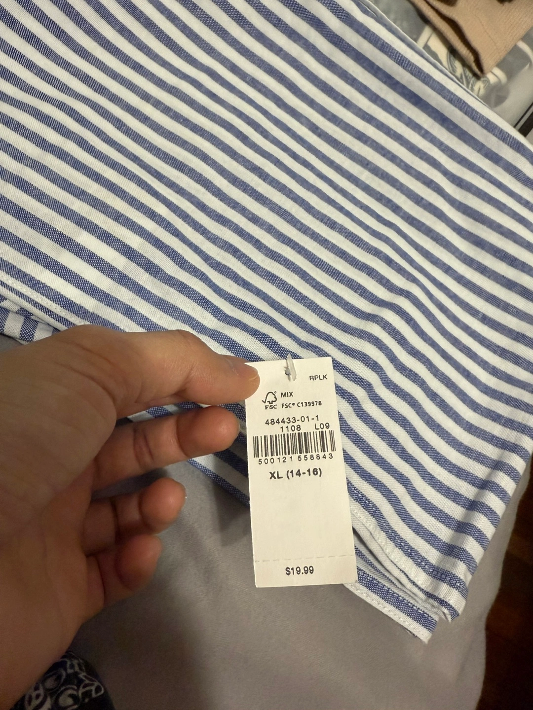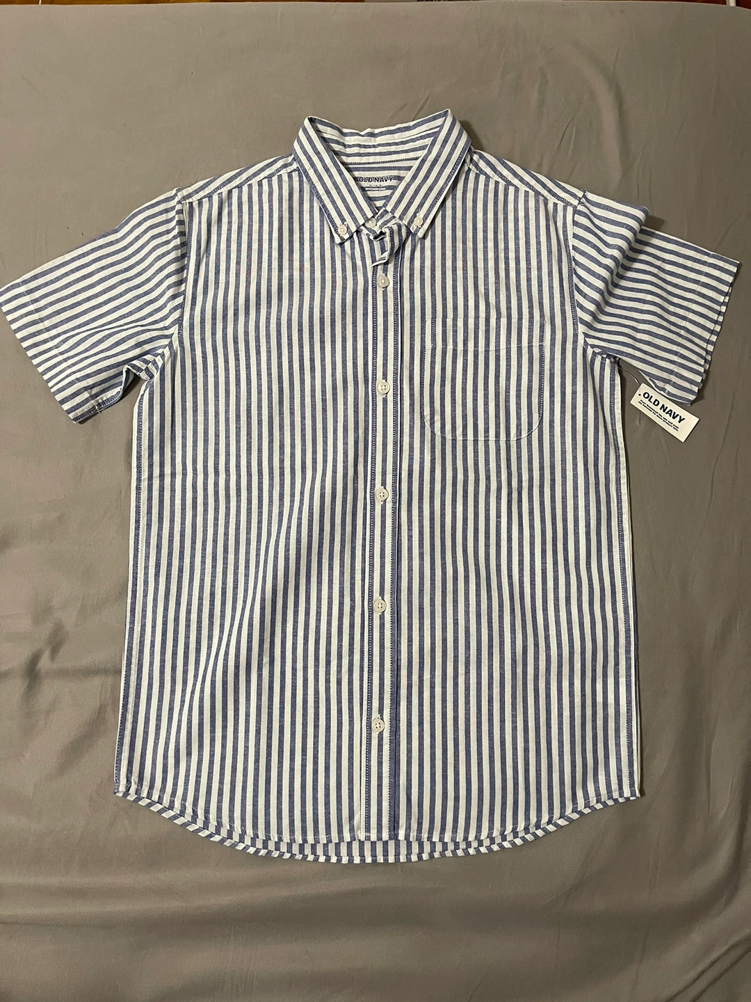 Old Navy short sleeve button-up shirt with a blue and white stripe pattern.