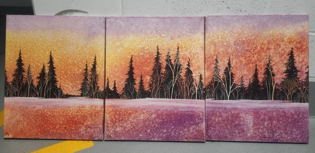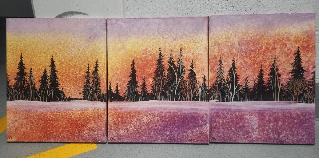 Beautiful 3-piece canvas painting of a forest with a sunset.