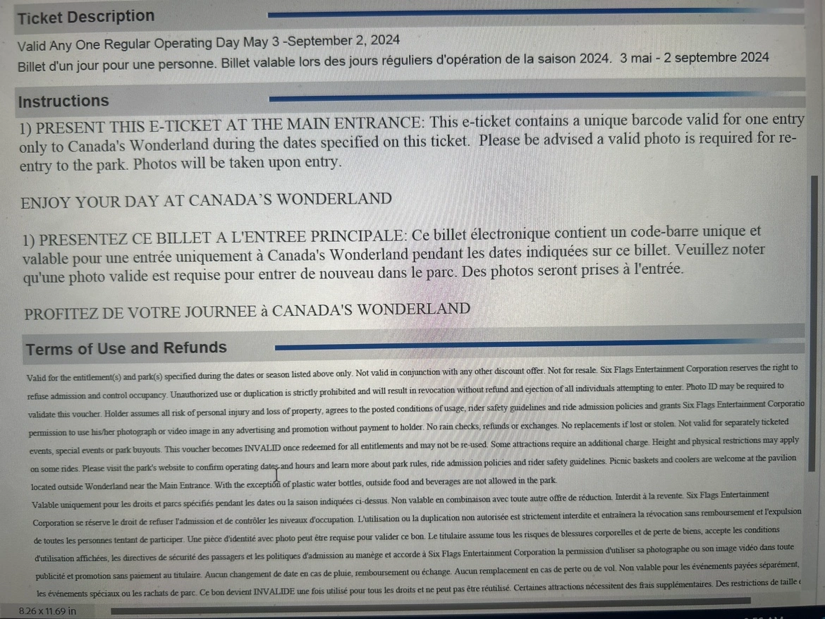 Buy & SellCanada's Wonderland E-TicketCanada's Wonderland E-Ticket$49This e-ticket is valid for one person on any regular operating day between May 3-September 2, 2024.WHERE TO MEETRazorbill CourtView MapSELLERverifiedAnnetteEast Credit1085 reviews0 chats·1 favorites·49 viewsSEND CHAT TO SELLERHi Annette! I’m interested in your listing.Hi Annette! I’m interested in your listing.Get the Karrot app to chatSign In to chat