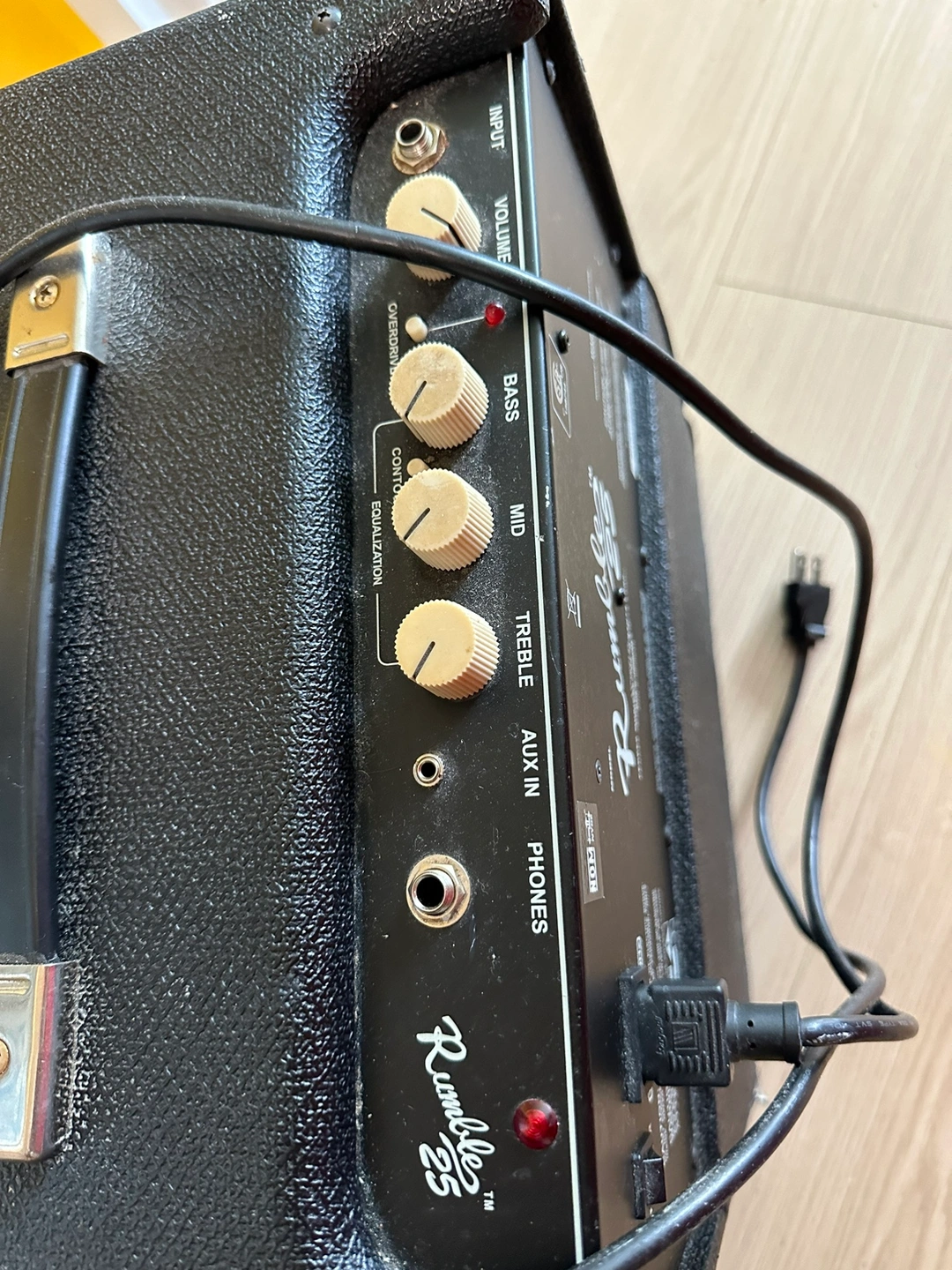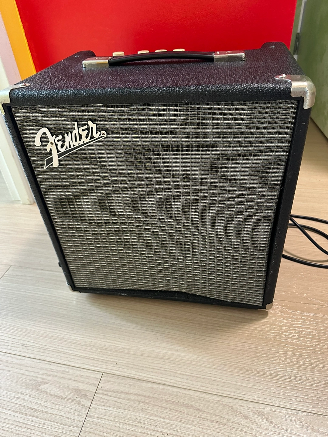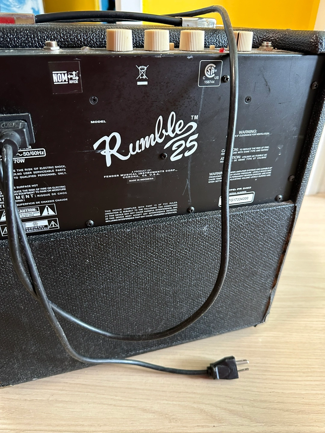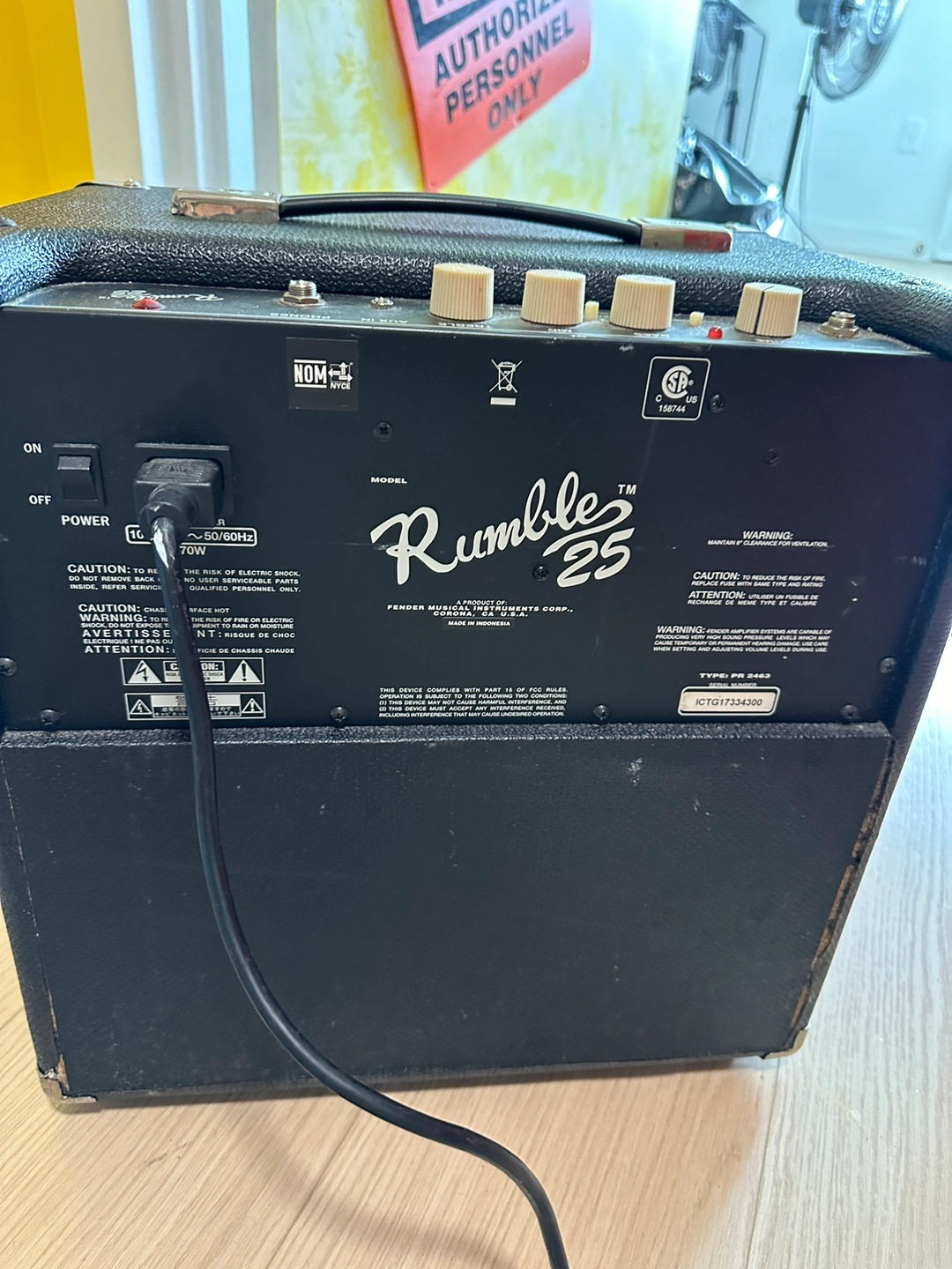 Fender Rumble25 bass amp with a 70 watt output. It features a 6.5" speaker, an auxiliary input jack, a headphone jack, and a built-in tuner. This Fender Rumble 25 100-120V 50-60Hz 70W 8" speaker bass combo amplifier has been tested and is ready to be used by a new owner. With its sleek black color and powerful 70 W amplifier type, this musical instrument will enhance the sound quality of any guitar or bass. The model name, Fender Rumble 25, is a well-known and respected brand in the music industry. This product is perfect for both beginners and professionals alike.pick up Bx thank you little damaged front as you can see