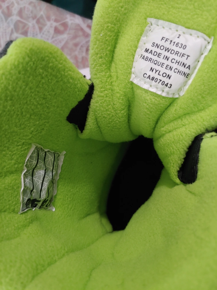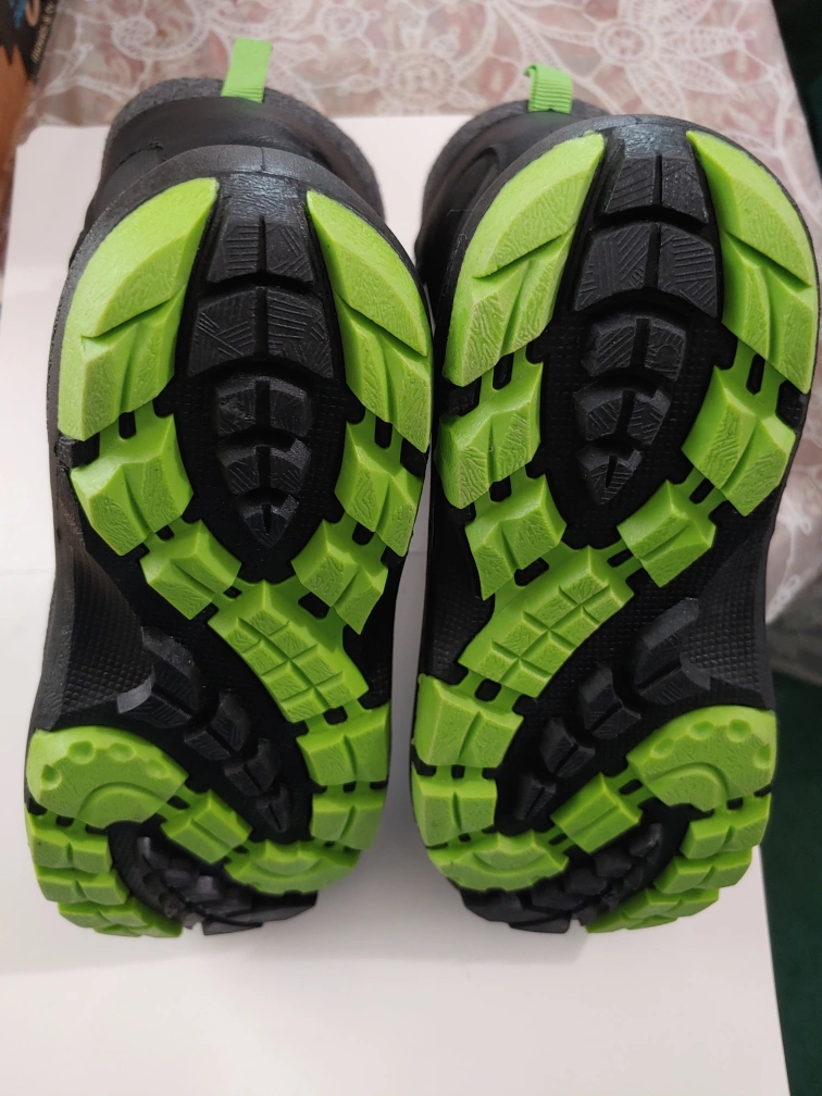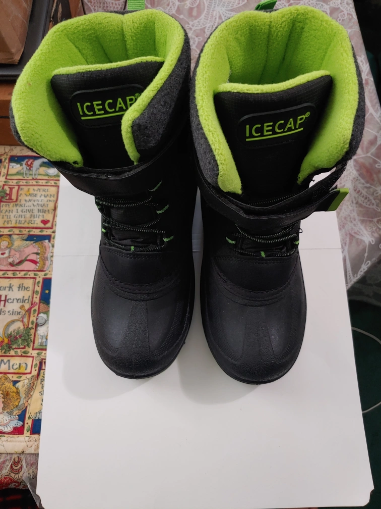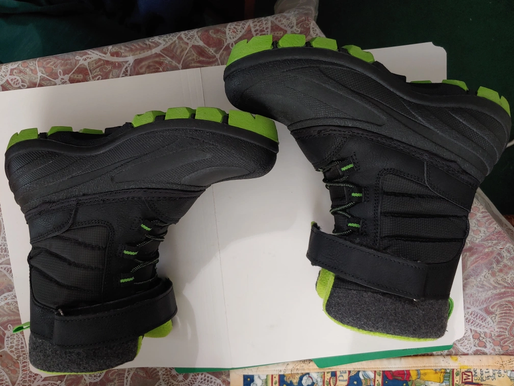 Black winter boots with green accents. Lace-up closure with velcro strap. Size 2.