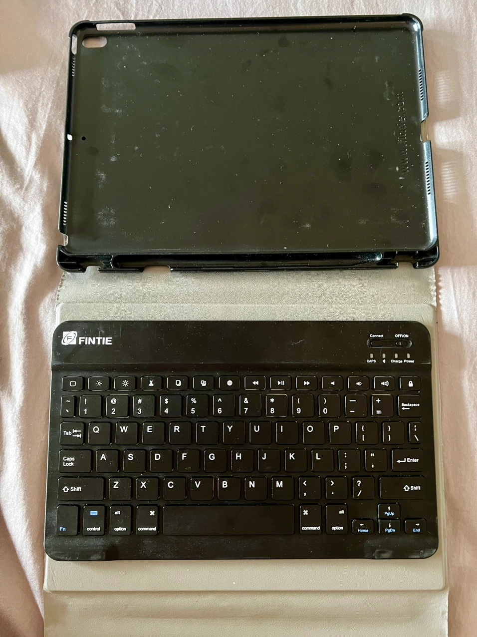 This is a Fintie keyboard case for an iPad 11.5”. The case is black and has a magnetic removable keyboard. The keyboard is also black. The keyboard has a built-in stand to hold the iPad upright. The keyboard has a row of shortcut keys at the top. The case has a built-in cover for the iPad.