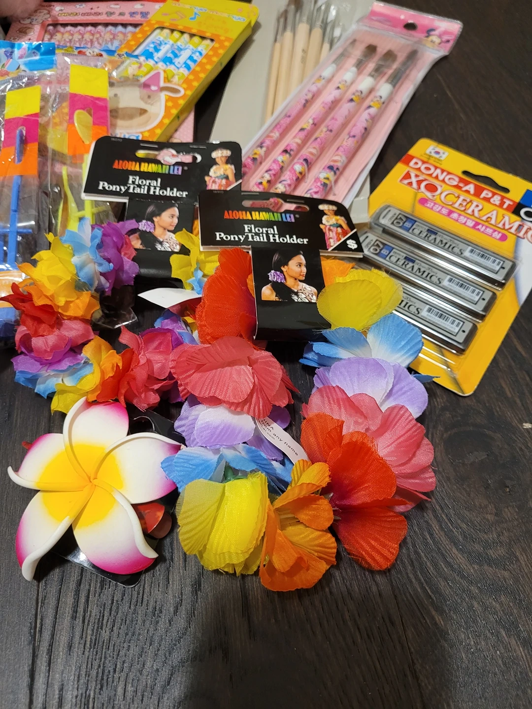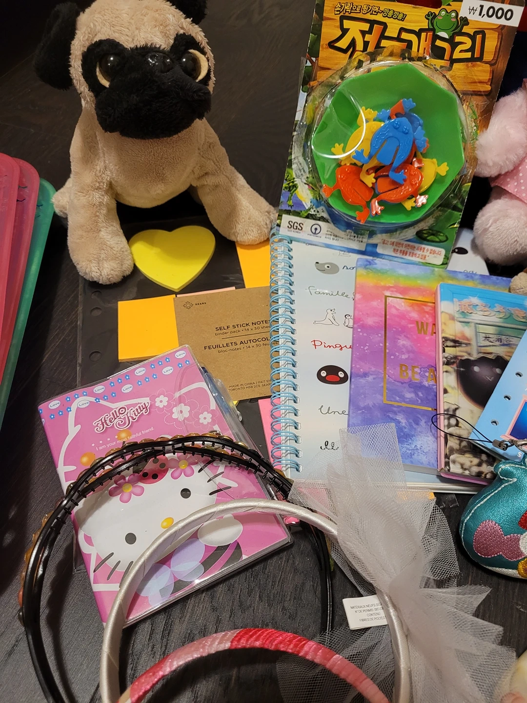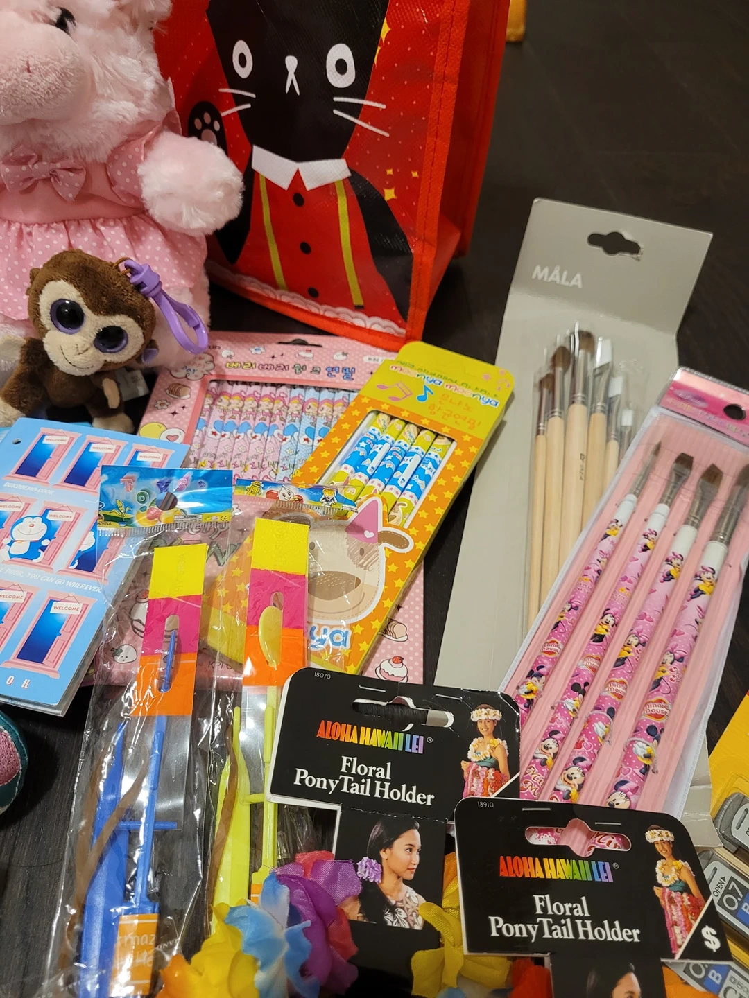 Everything in the pictures is included! From notebooks, to pencils, to sticky notes, to stuffed animals, to hair accessories! Everything is completely brand new and has never been used! The ones that came from a package are still inside the package!