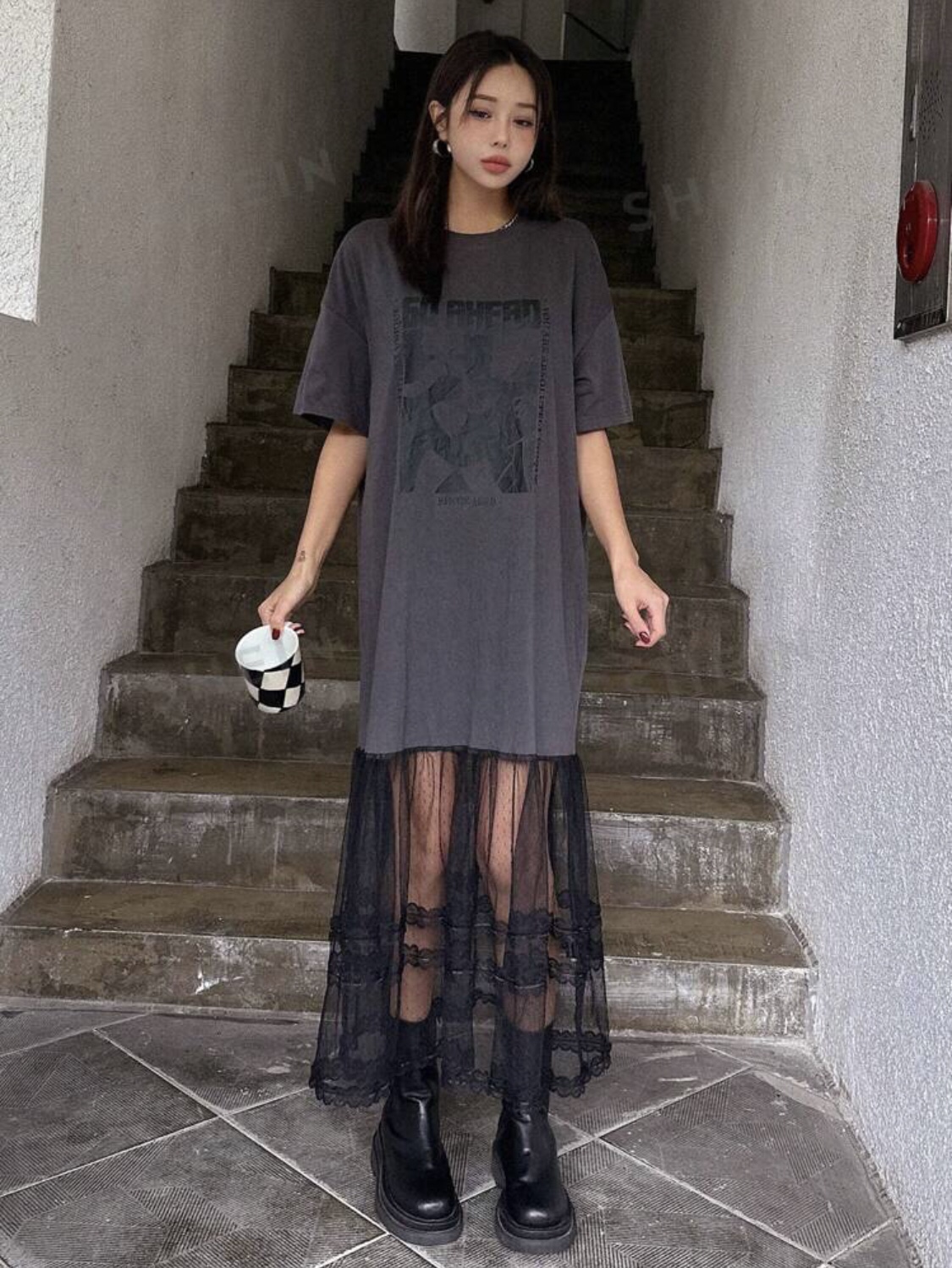 Grey graphic T-shirt dress with a black lace skirt. The skirt is layered and has a sheer look. The dress is short-sleeved and fits loosely. The graphic on the dress is an image of a person with a caption in black.