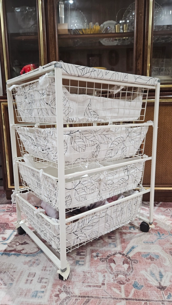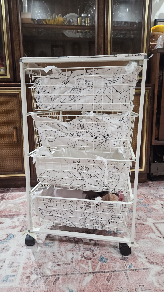 This is a 4-tier rolling storage cart with fabric liners. It is a great way to organize your home or office.
