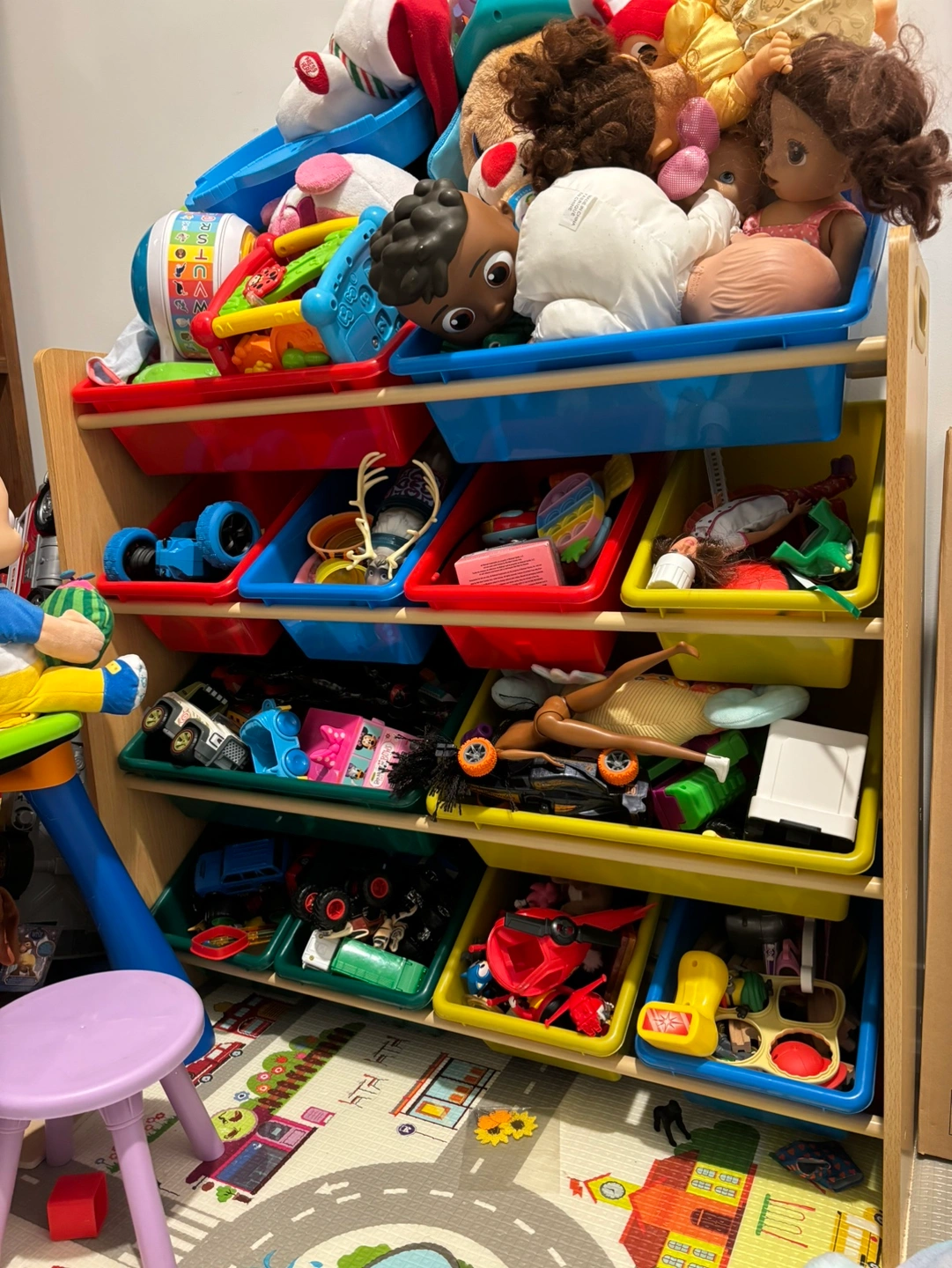 A multi-level toy organizer with multiple bins. This storage unit is a great way to organize and store your child's toys. It is in good condition and comes with many different coloured bins.