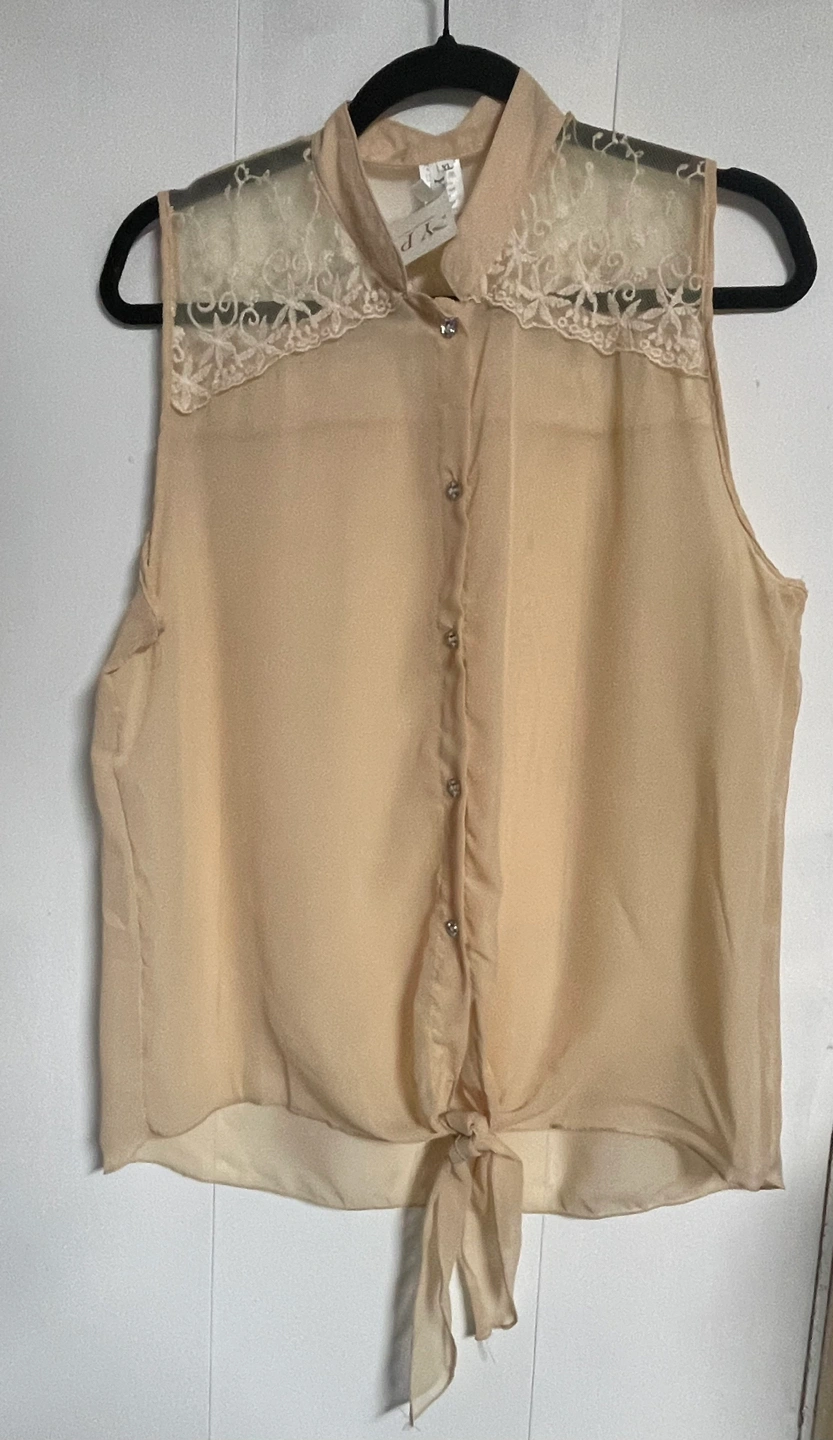 •This light and airy, sheer top is so feminine with its front tie and diamond like buttons.
