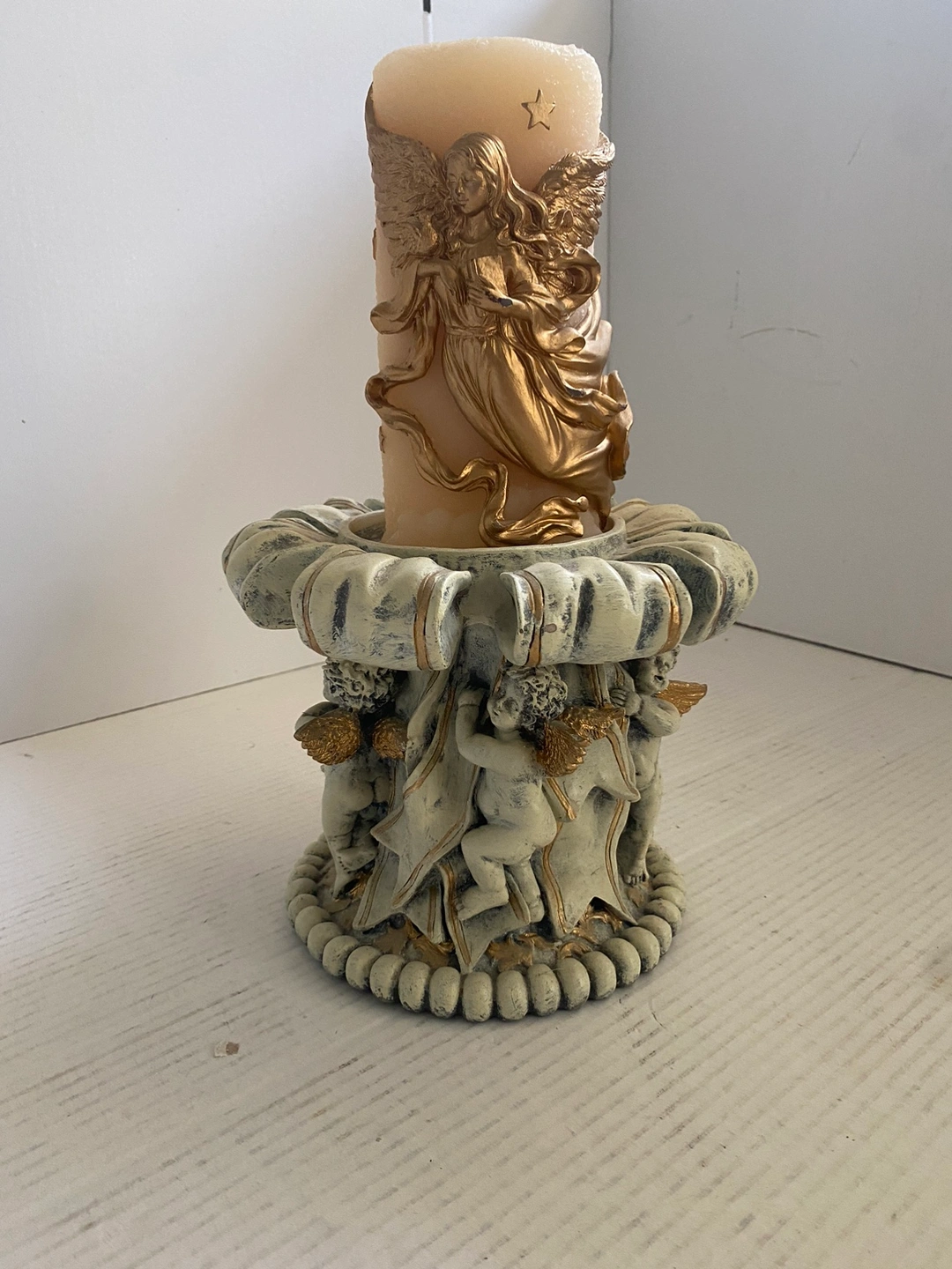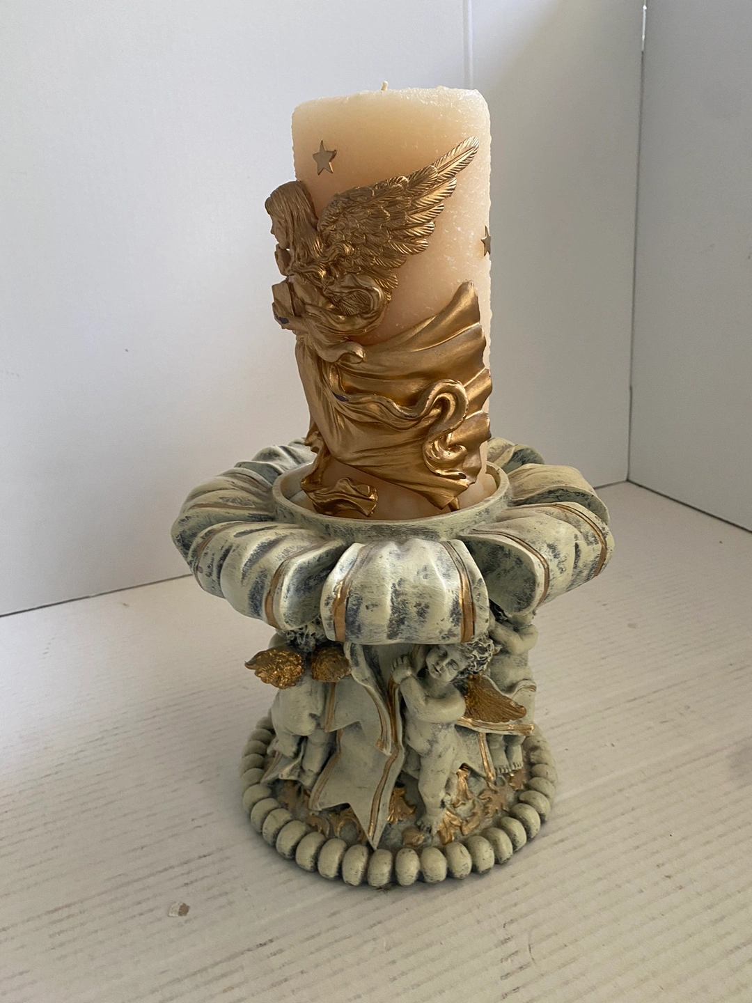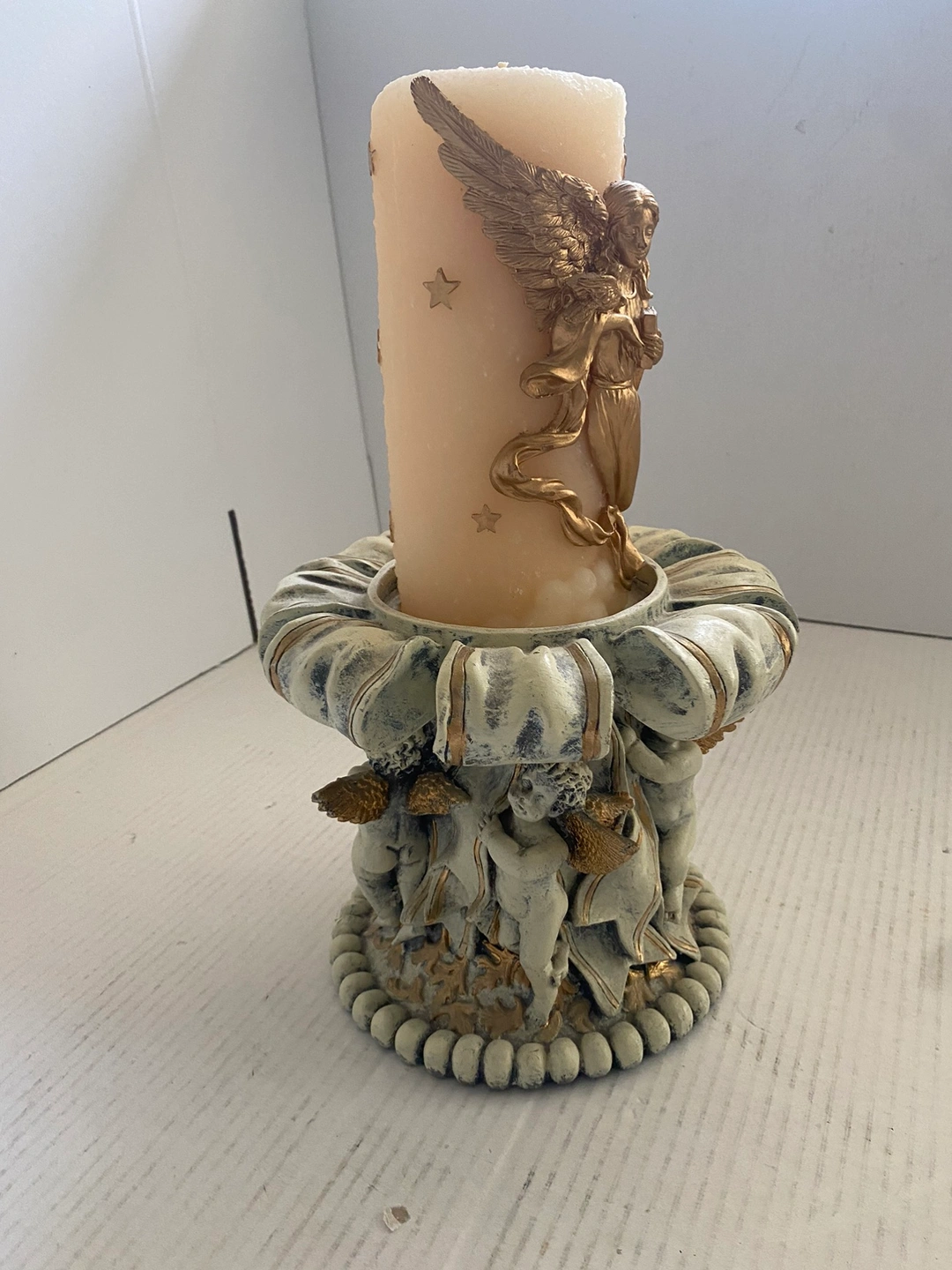 A lovely candle holder with an angel design and gold accents. It has a tall pillar candle holder with a floral base. The base is detailed with several cherubs. The holder is made of resin.