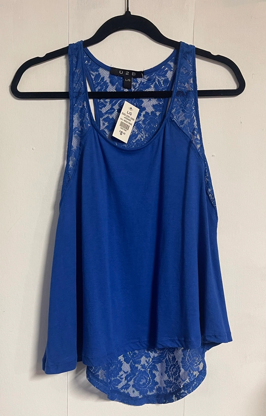 Blue tank top with lace detail on shoulders and full back lace. Size: Large Brand: U2B Condition: NEW with Tag on Selling:$4.00