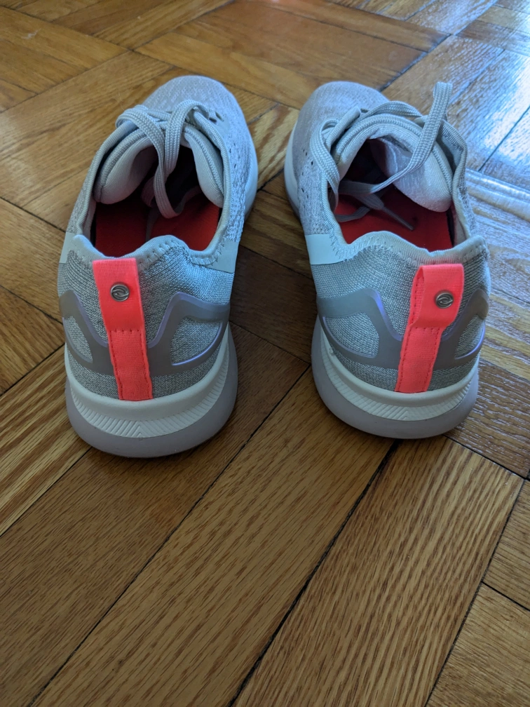 These are a pair of running shoes by Ryka. They are grey and have a pink accent. They are a size 10 ladies. A bit on the smaller side so could fit a 9 or 9 and 1/2. Only worn a few times