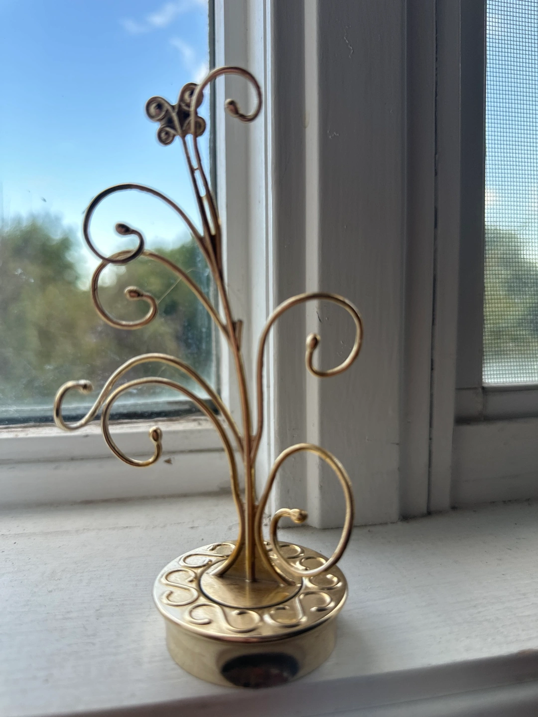 This stand is perfect for organizing and displaying your jewellery. It is made of metal and has a gold finish. It is in the shape of a tree with a circular base. I hope someone can use it :)