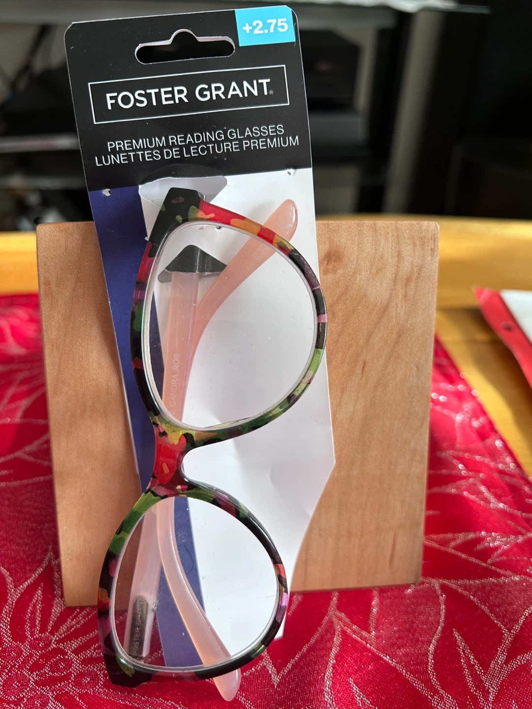 Foster Grant premium reading glasses with a colourful floral pattern. These glasses have a +2.75 magnification.