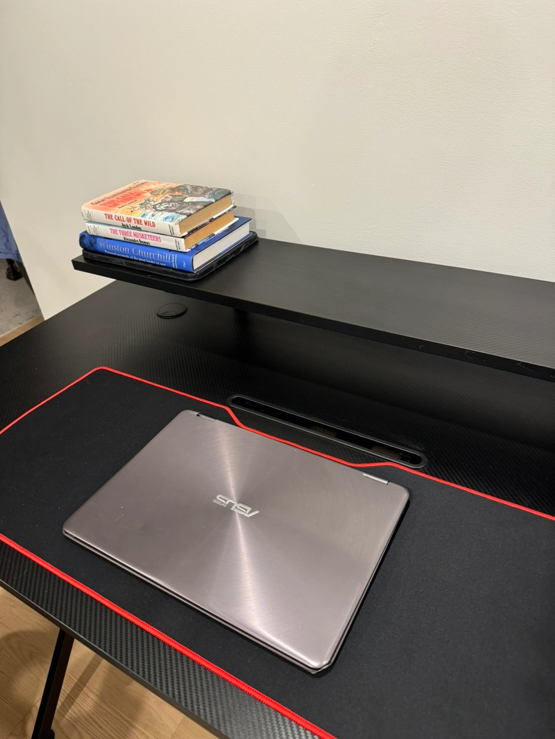 This desk comes with a built-in cable management tray, a top shelf for additional storage, and a large mousepad.