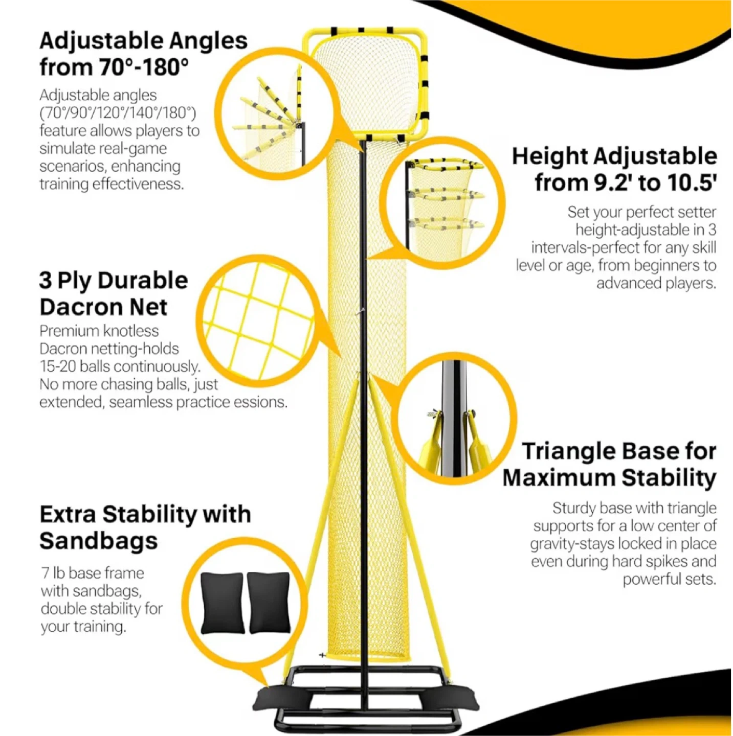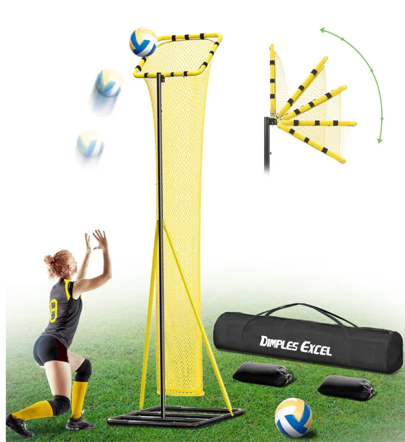 Dimples Excel 10.5FT adjustable volleyball setter training net with 3 height levels and 5 angles (70 - 180 degrees).