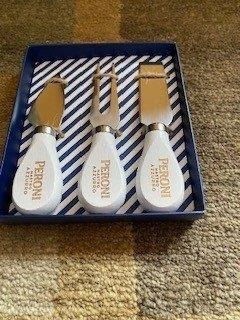 Set of three cheese knives with white wooden handles and silver blades. The knives come in a blue and white striped box. Perfect for serving cheese at your next party. From a smoke and pet free home. Pickup only in the St. Lawrence market area of downtown Toronto. Cash only.