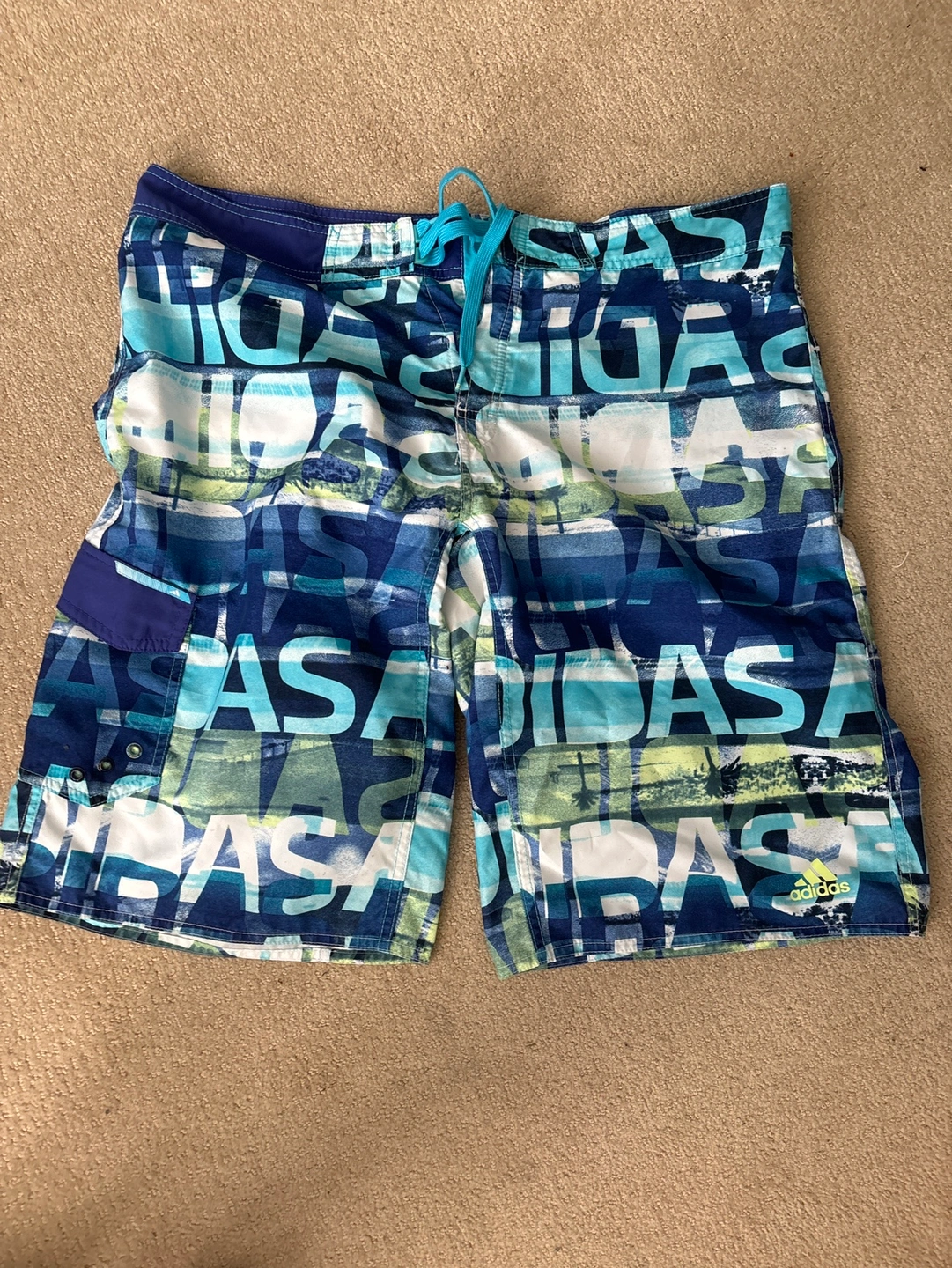 Blue and white Adidas swim trunks with a large Adidas logo on the front and a pocket on the left side. The size tag indicates size large. The trunks are made of a quick-drying material and have a drawstring waist.