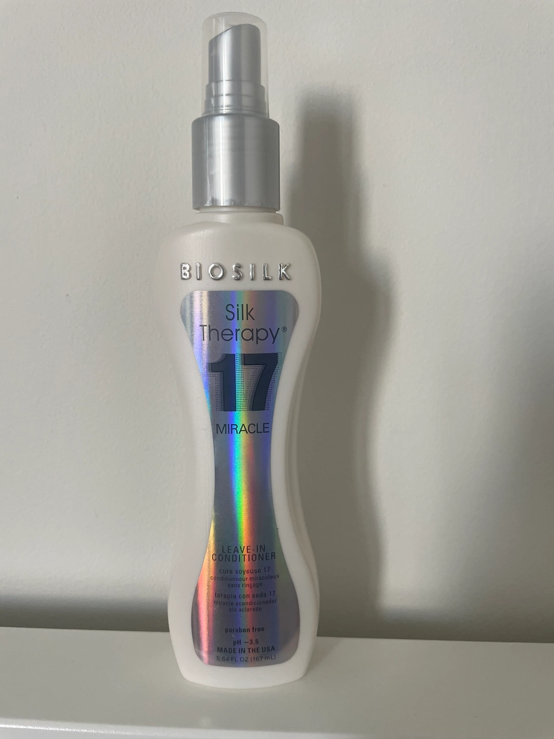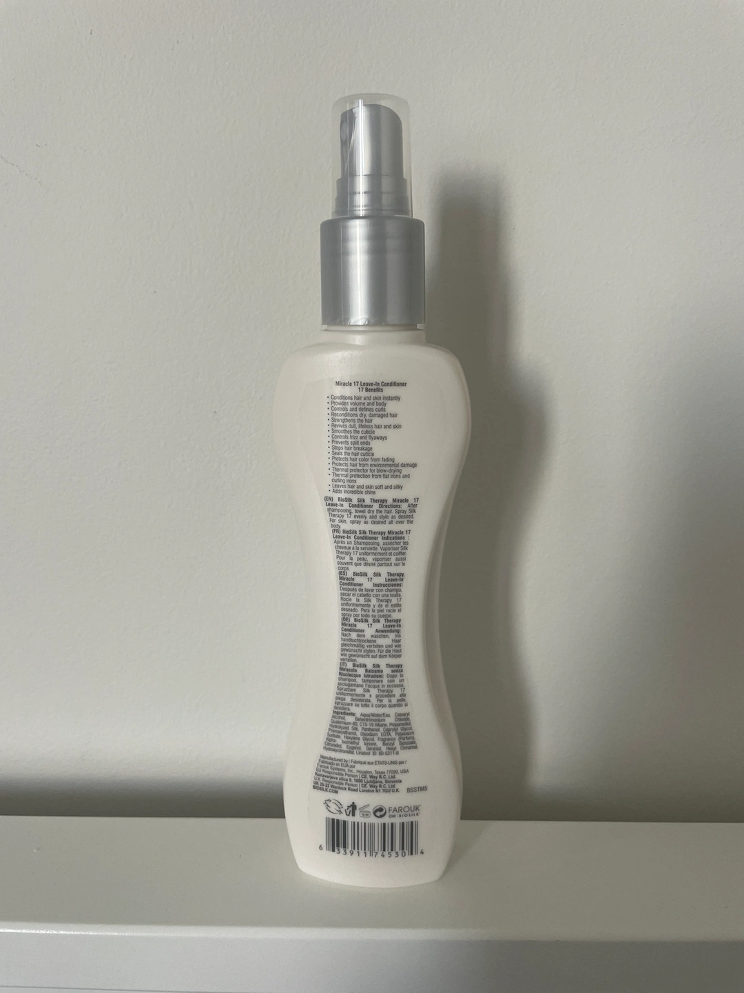 A bottle of Biosilk Silk Therapy 17 Miracle Leave-In Conditioner.