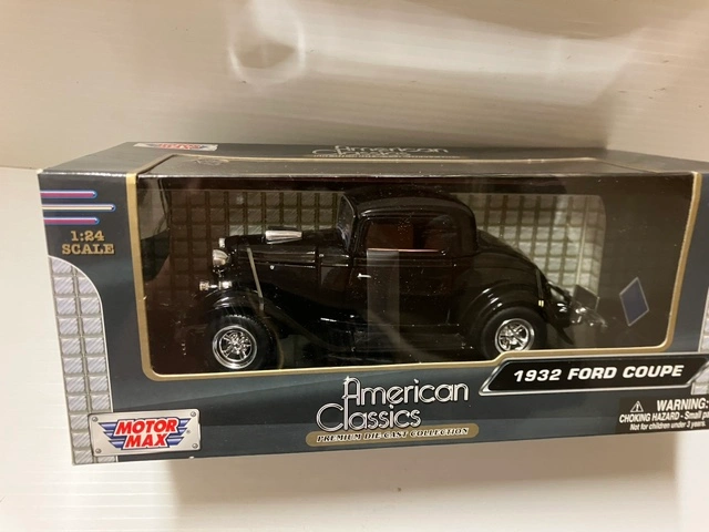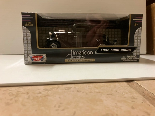 This is a 1:24 scale die cast model of a 1932 Ford Coupe, manufactured by Motor Max. It is part of the American Classics series of die cast cars. It comes in the original packaging.