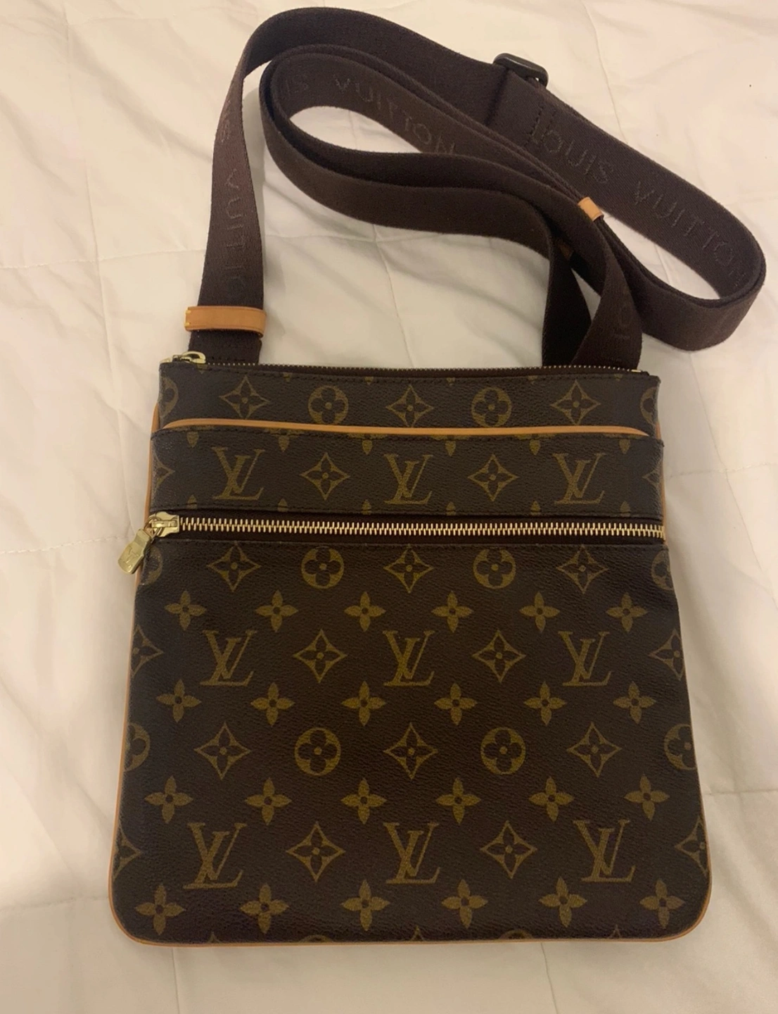 This is a genuine Louis Vuitton crossbody bag in the classic monogram canvas. It features a brown adjustable strap and gold hardware.