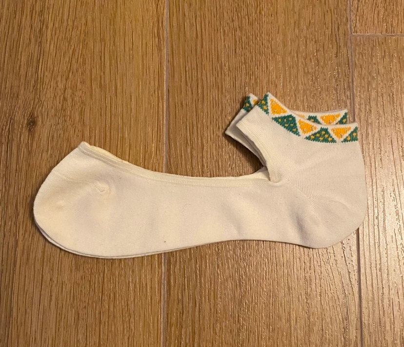 A pair of brand new women's no-show socks with a geometric pattern on the top. The socks are off-white in colour.