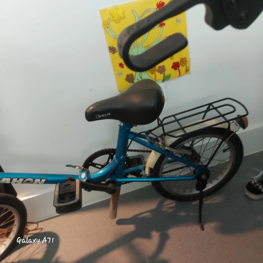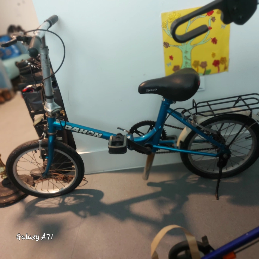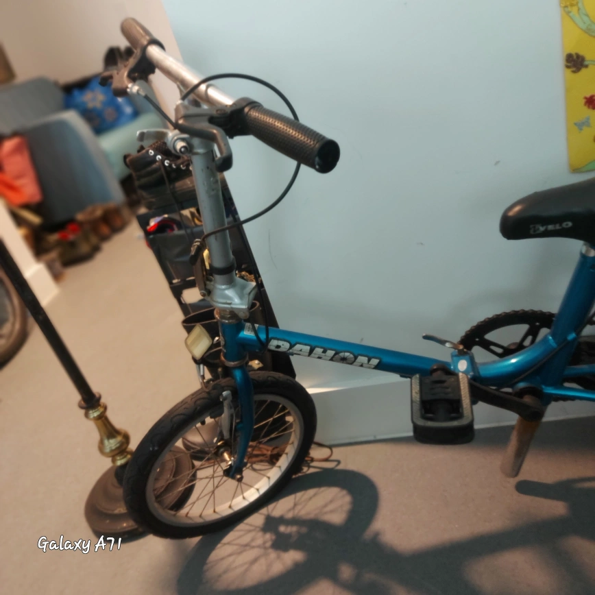 146*VINTAGE-BLUE DAHONE FOLDING BIKE. *NEEDS A LITTLE BIT OF TLC. OTHERWISE IN GOOD CONDITION. *ALL ORIGINAL PARTS EXCEPT FOR THE SEAT HAS BEEN REPLACED WITH A MORE MODERN VERSION.