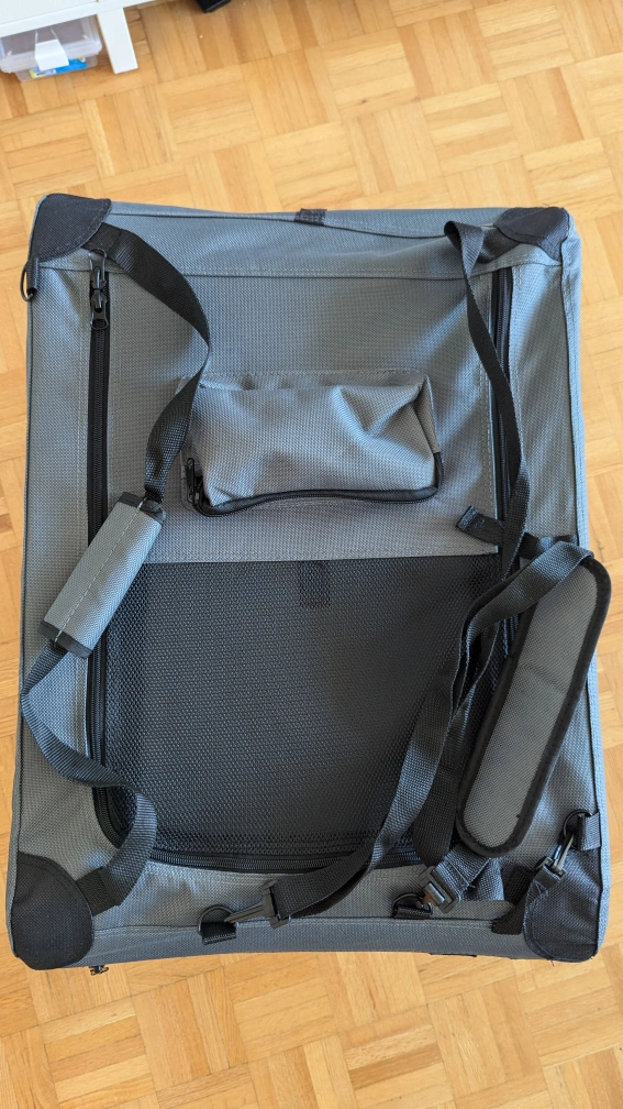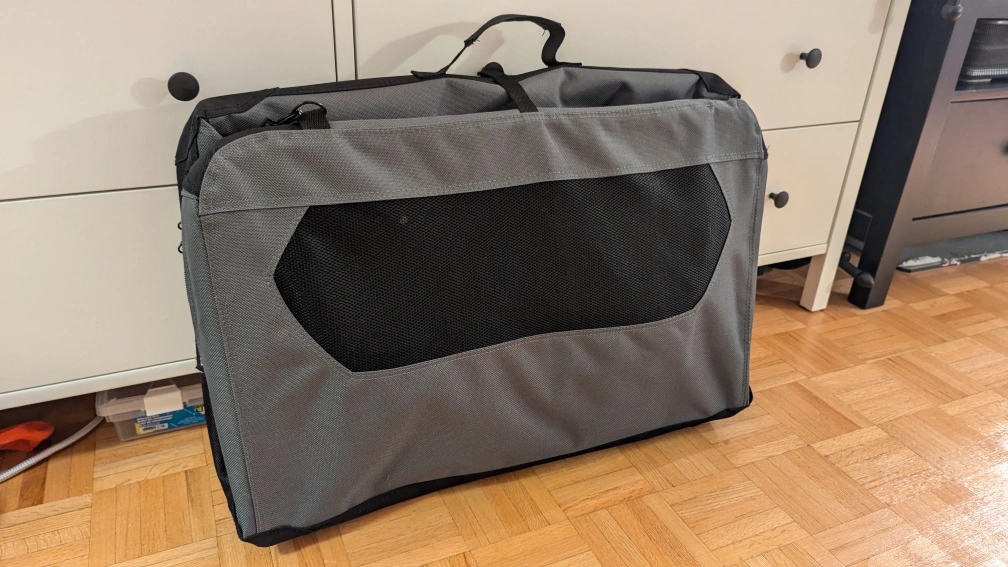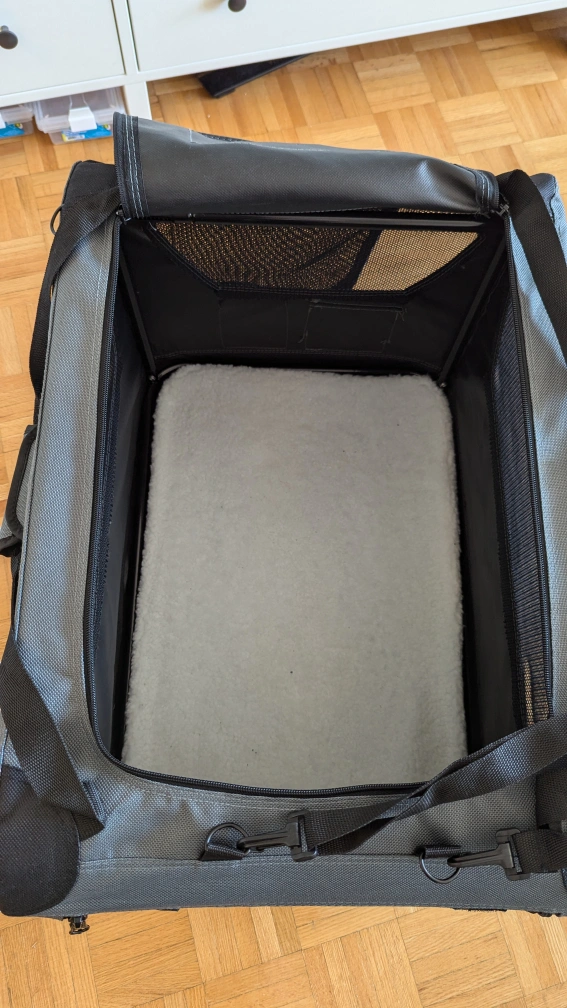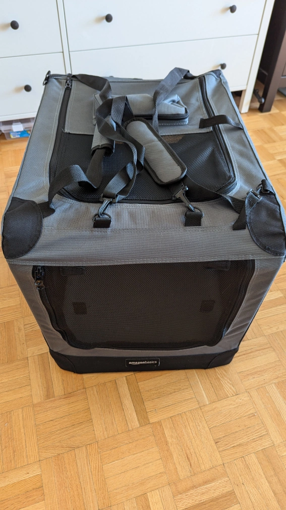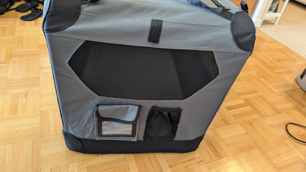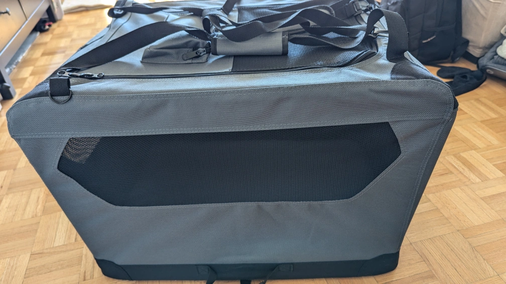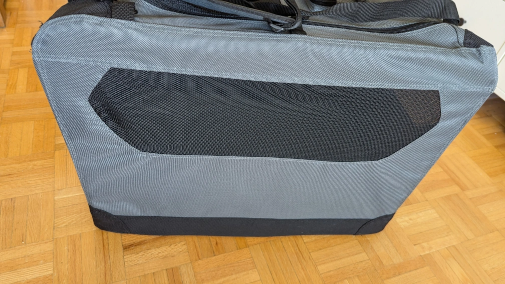 Folding pet carrier / crate for sale. It has only been used a couple of times and been sturdy every time. It has an interior frame that helps it keep shape. Top and front access with zippers that are nice and smooth.