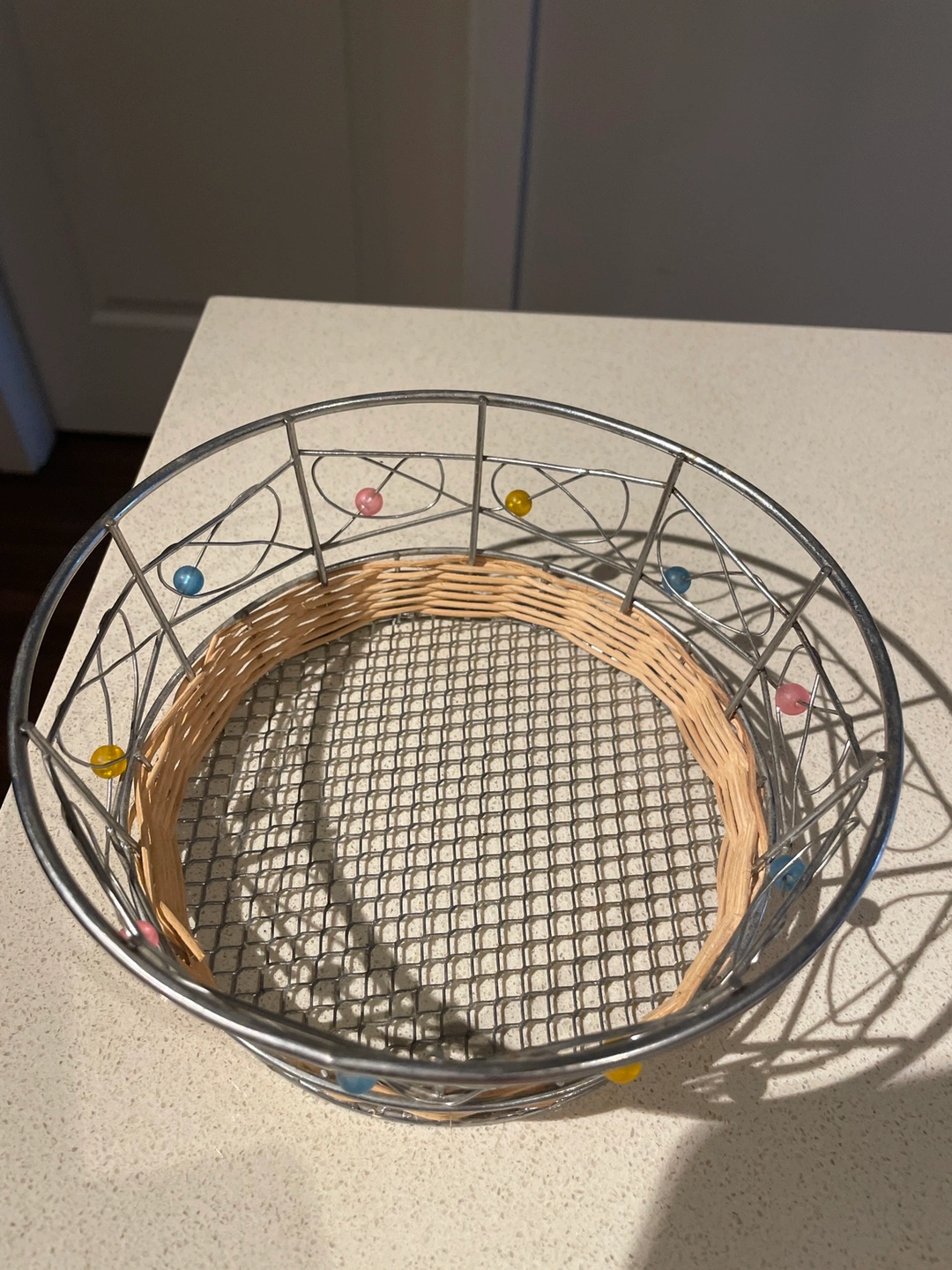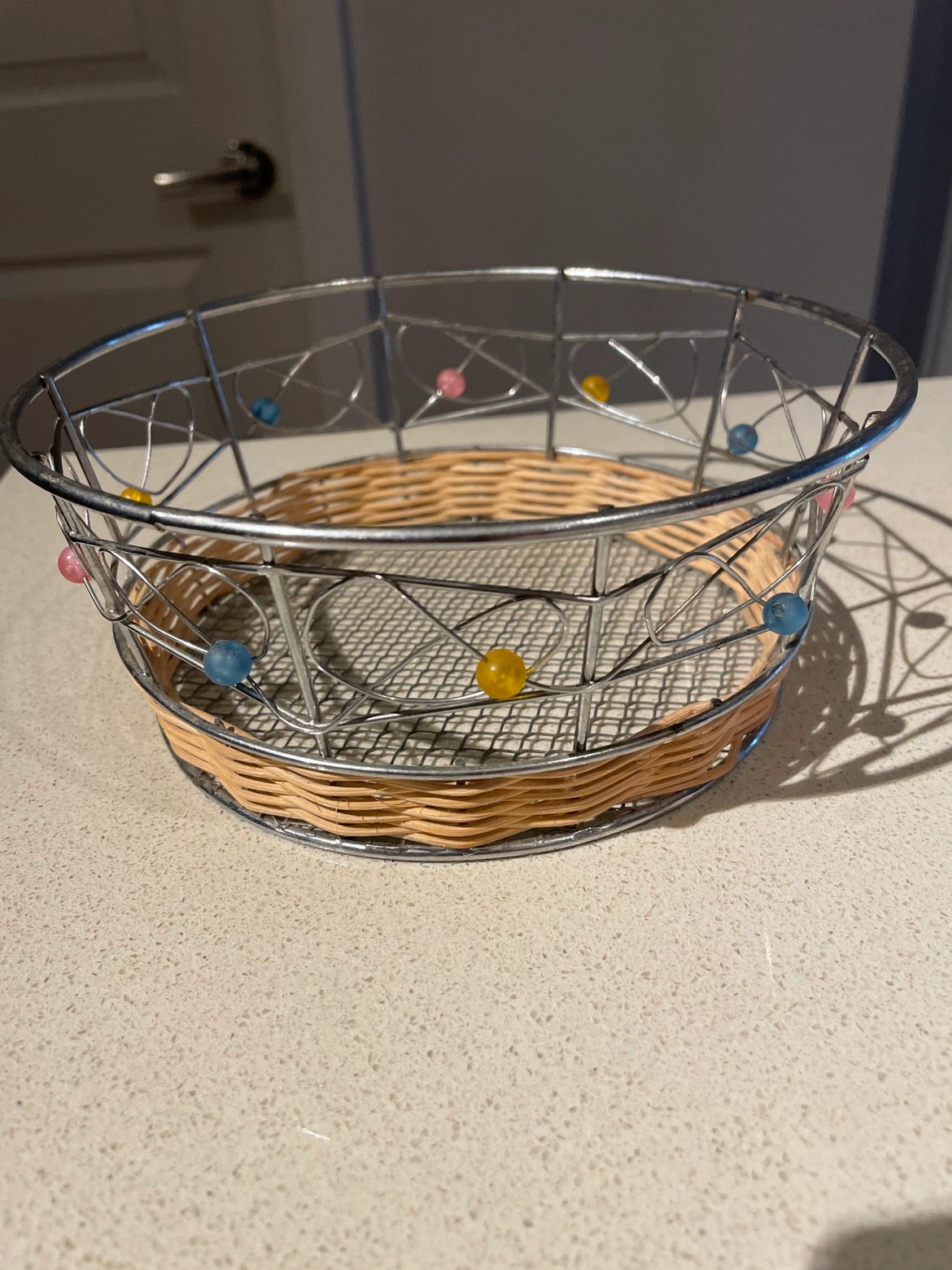 This is a decorative metal wire basket with a rattan base and colorful beads. The basket is great for holding fruit, vegetables, or other small items.