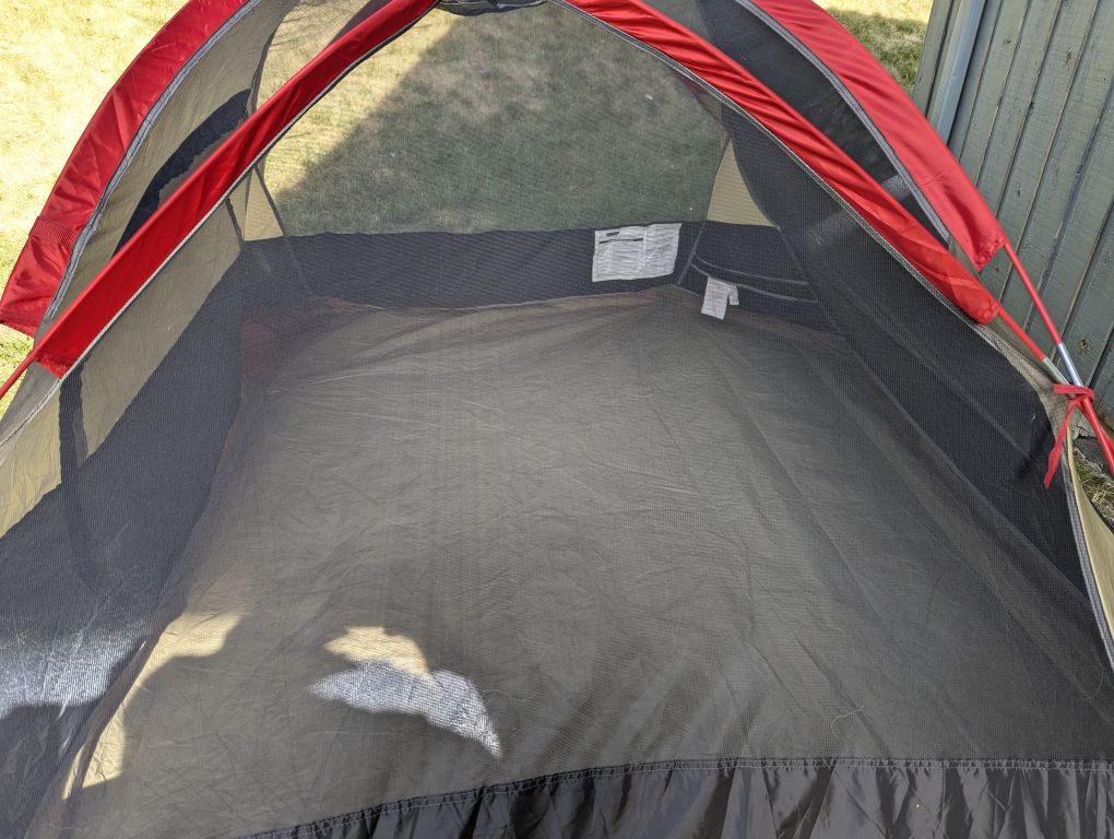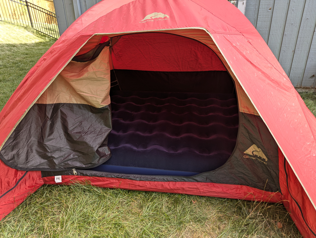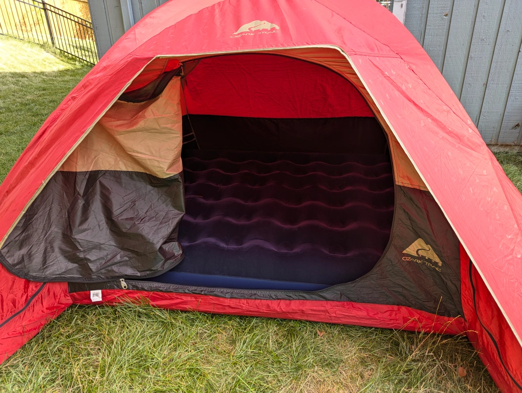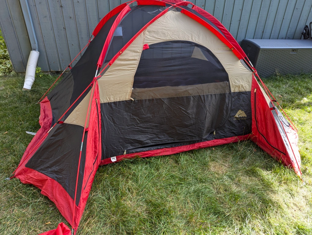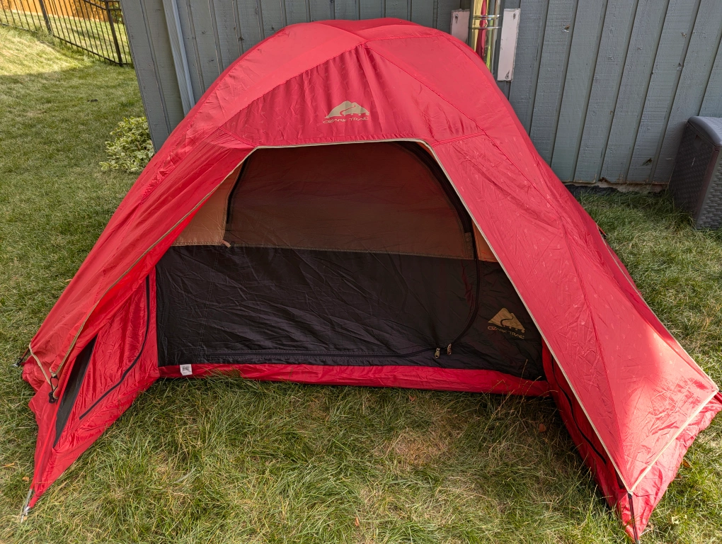 Ozark Trail dome tent. In pretty good condition, no breaks in the screen. Has nice kick out in front with zippers for putting things like shoes. Has all hardware.