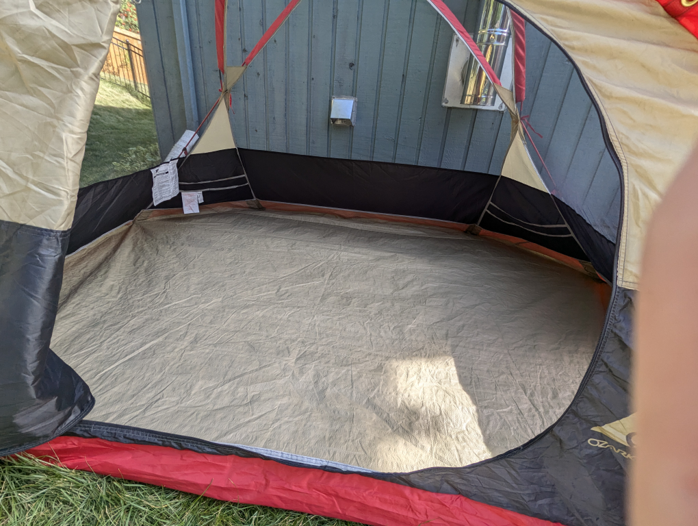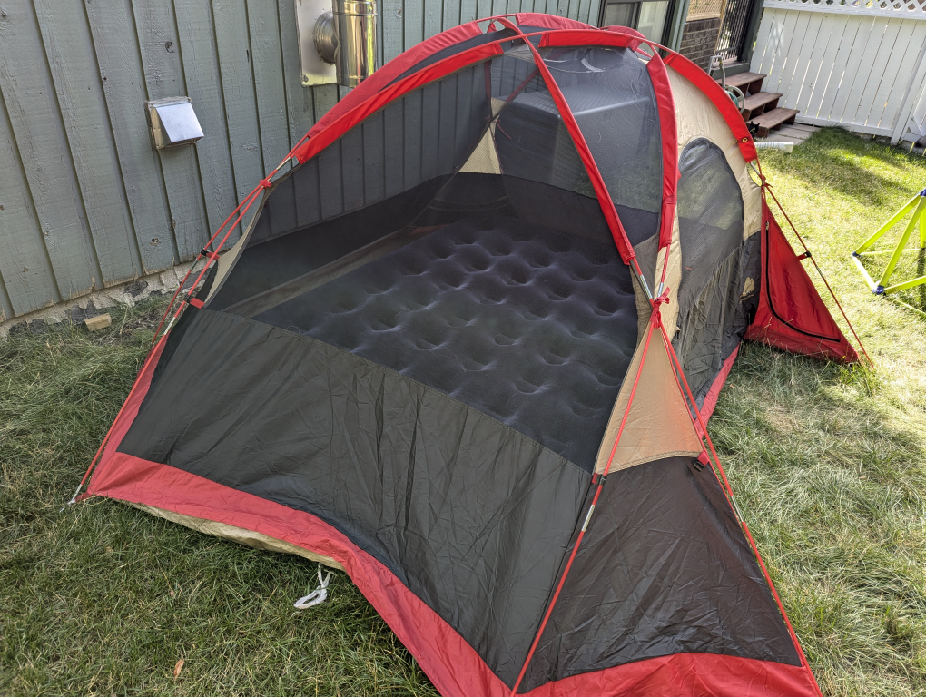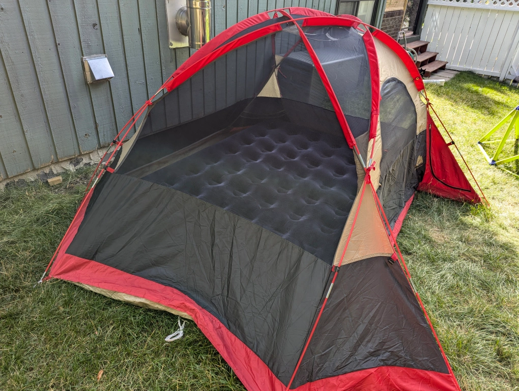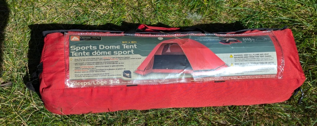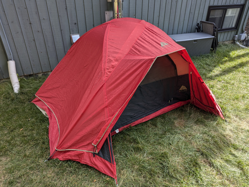 Ozark Trail dome tent. In pretty good condition, no breaks in the screen. Has nice kick out in front with zippers for putting things like shoes. Has all hardware.