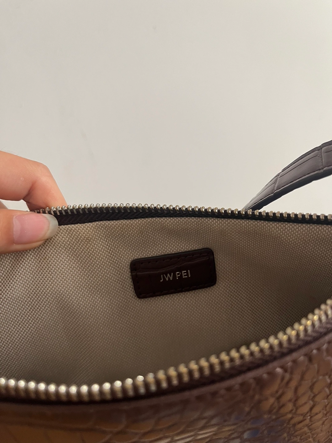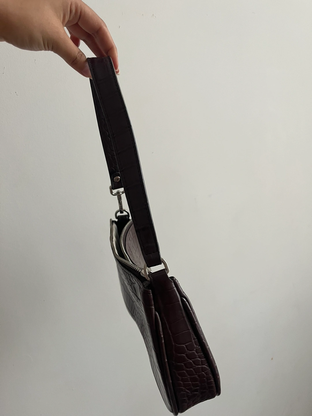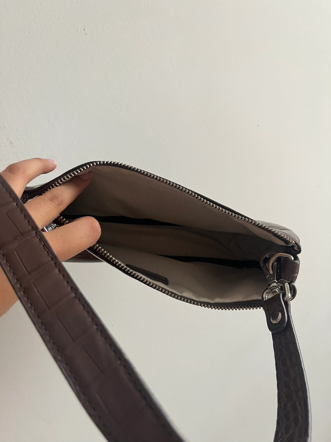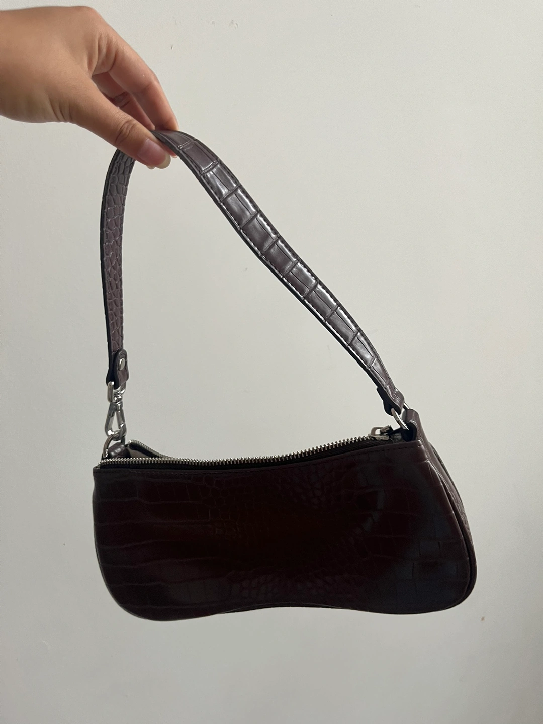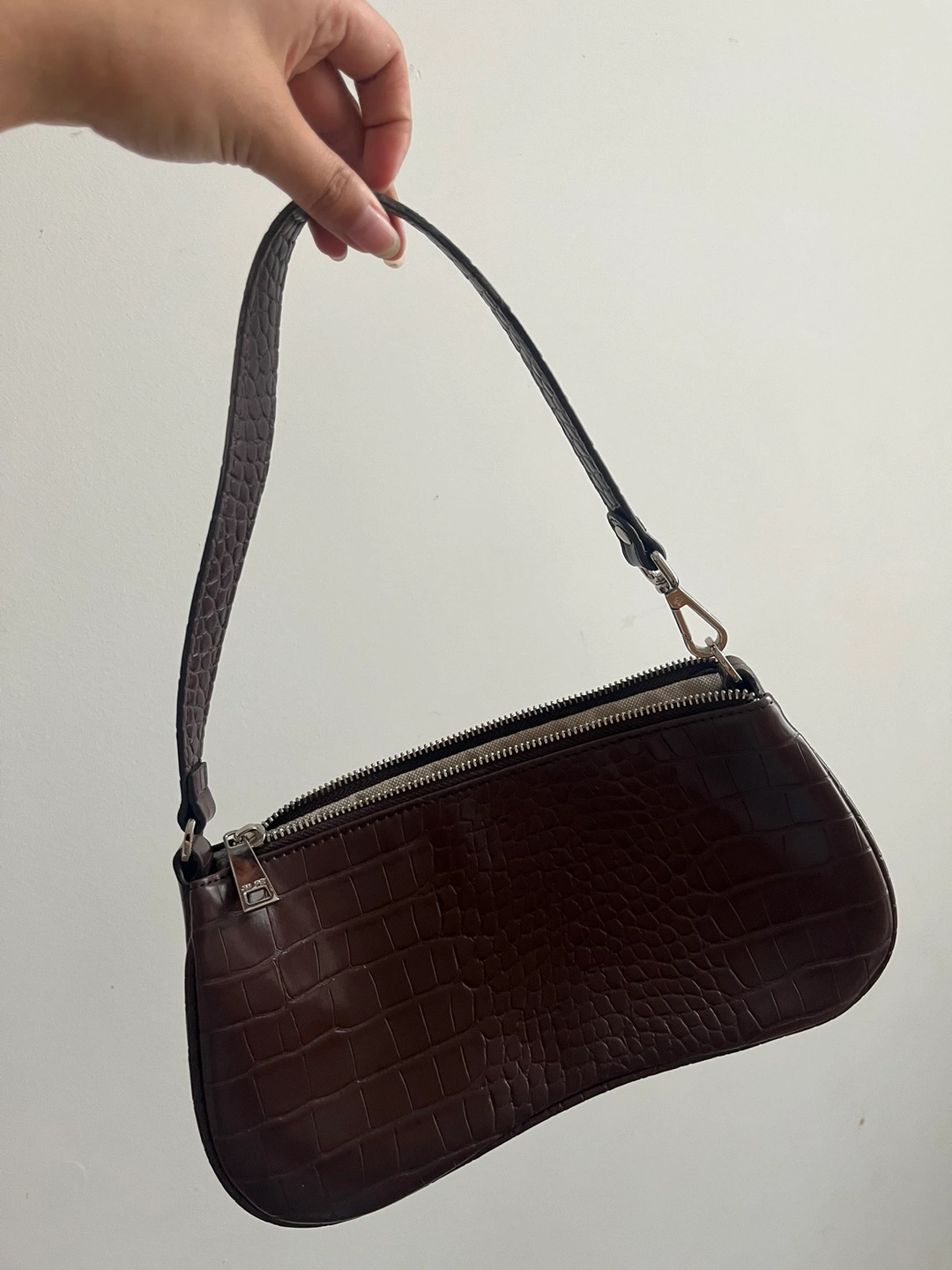 A small brown bag with a crocodile-embossed pattern and a single shoulder strap. Silver zipper. Can pack a lot! Phone, keys, napkins, sunglasses etc. Bought for ~$100.