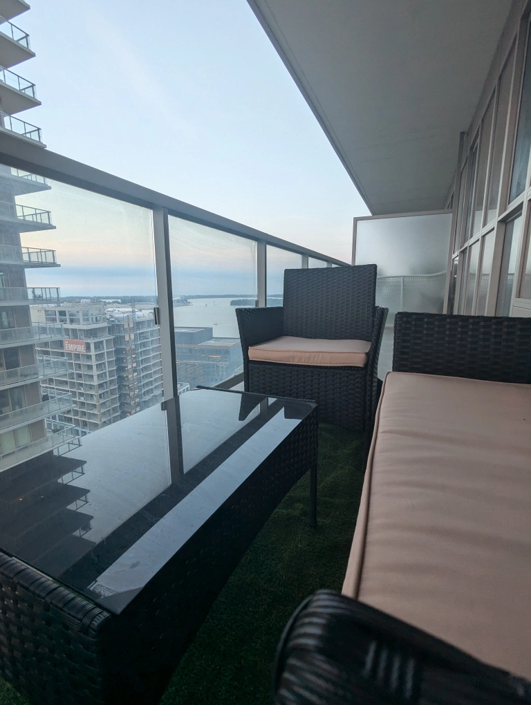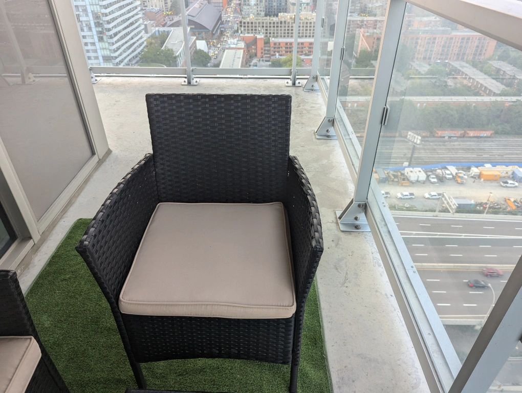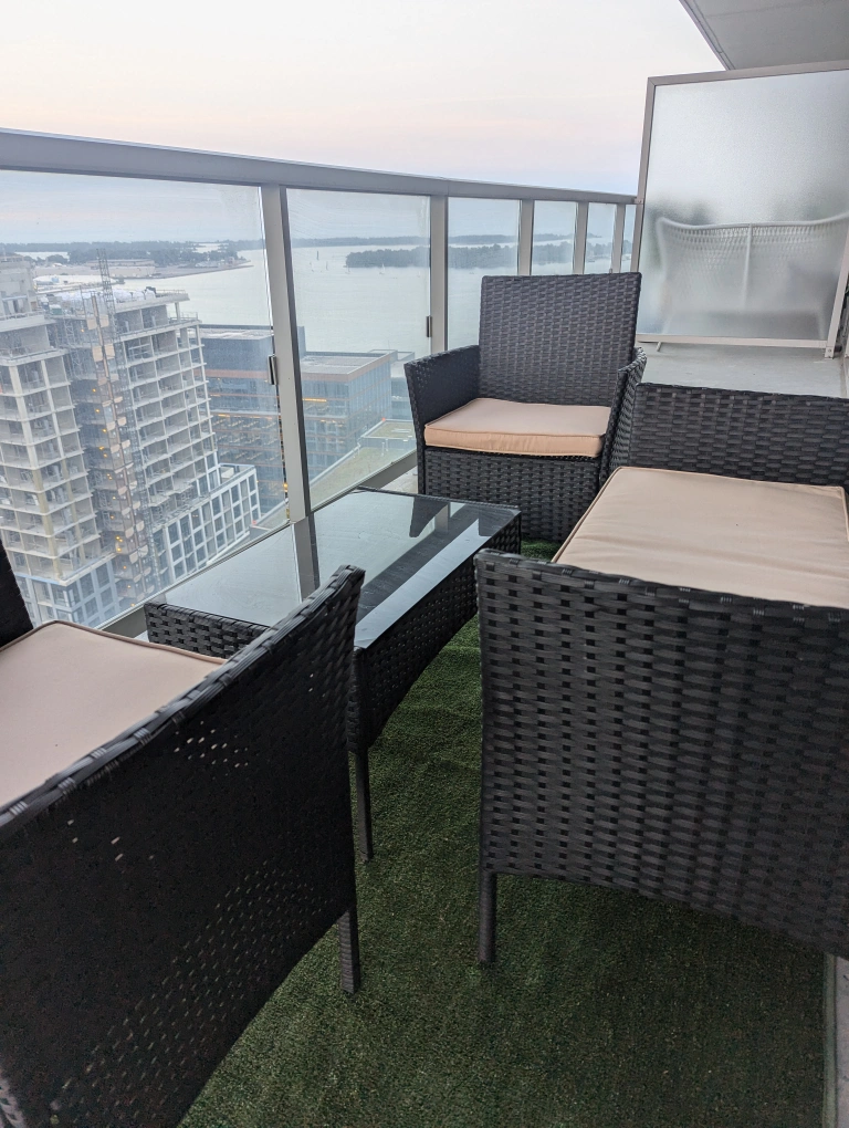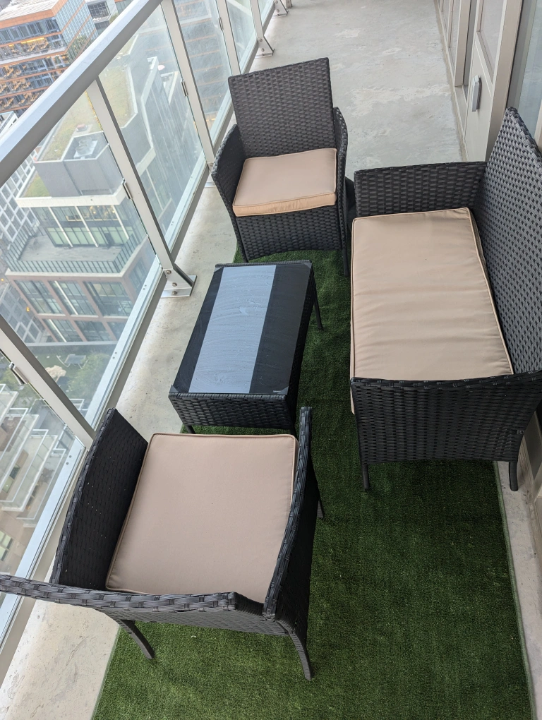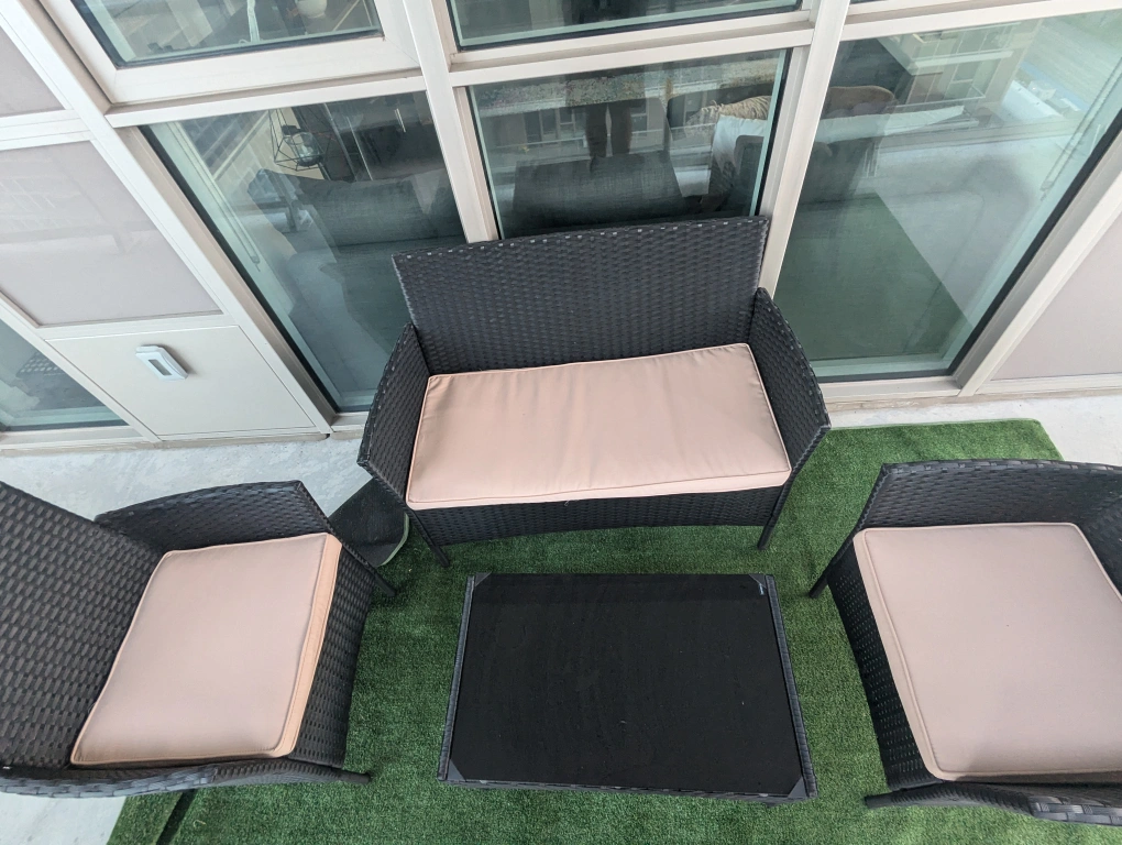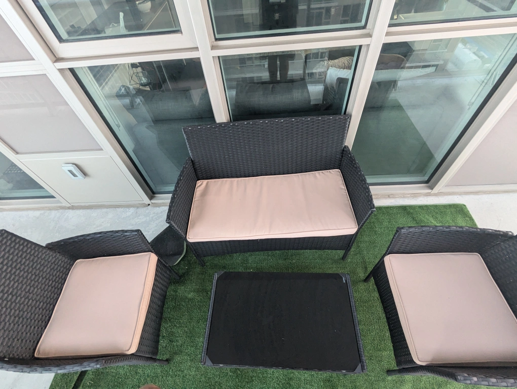 Very lightly used patio furniture perfect for a condo or a backyard. No damages. Great for entertaining guests or to just have a sip of coffee while enjoying the outside!