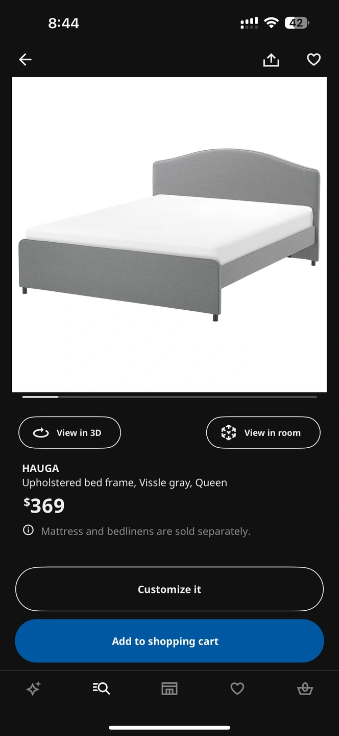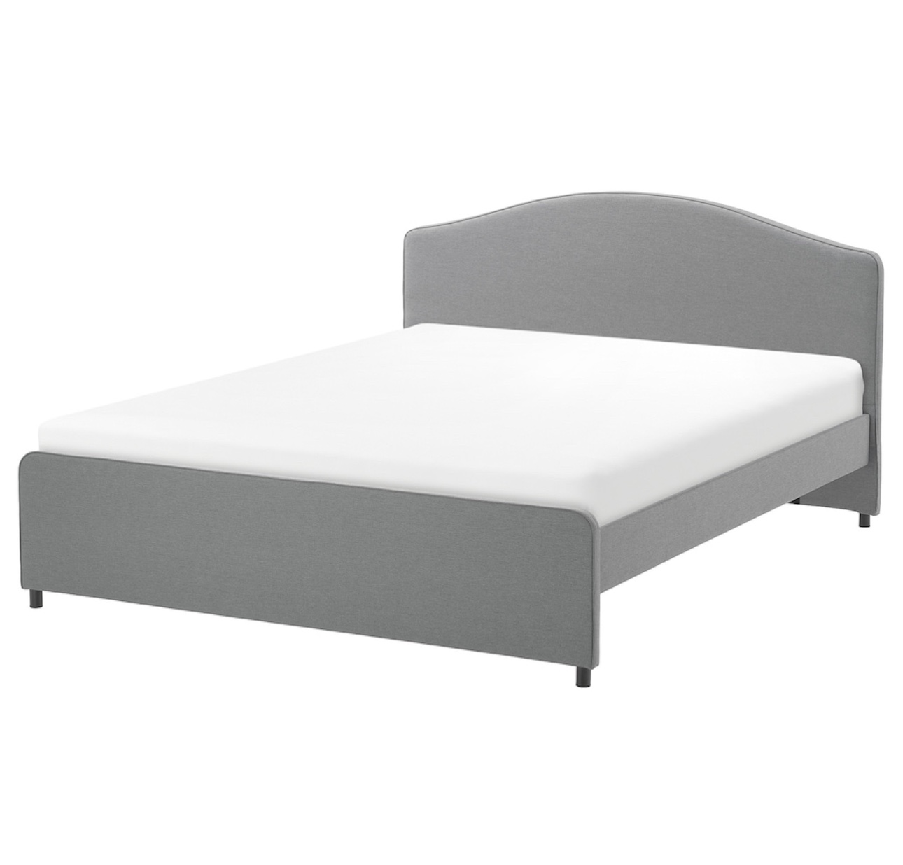 Grey upholstered bed frame with a headboard that curves at the top. It has a slatted base and is in good condition. It is 66 1/2 inches wide, 83 1/8 inches long, and 39 3/8 inches tall.