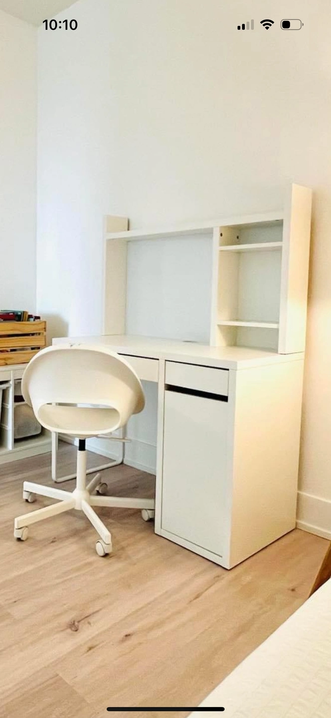 This desk has a hutch with shelves and a drawer. It is white and has a modern design.