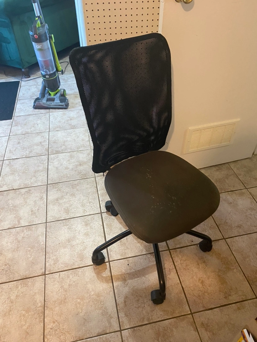Black mesh back and grey fabric seat. Five wheels. Adjustable height. In good condition, but some stains on the seat. Previous owner was an arts impressed guy so I promise they’re not gross stains. Cat definitely use the back as a scratching post, but it works just fine.