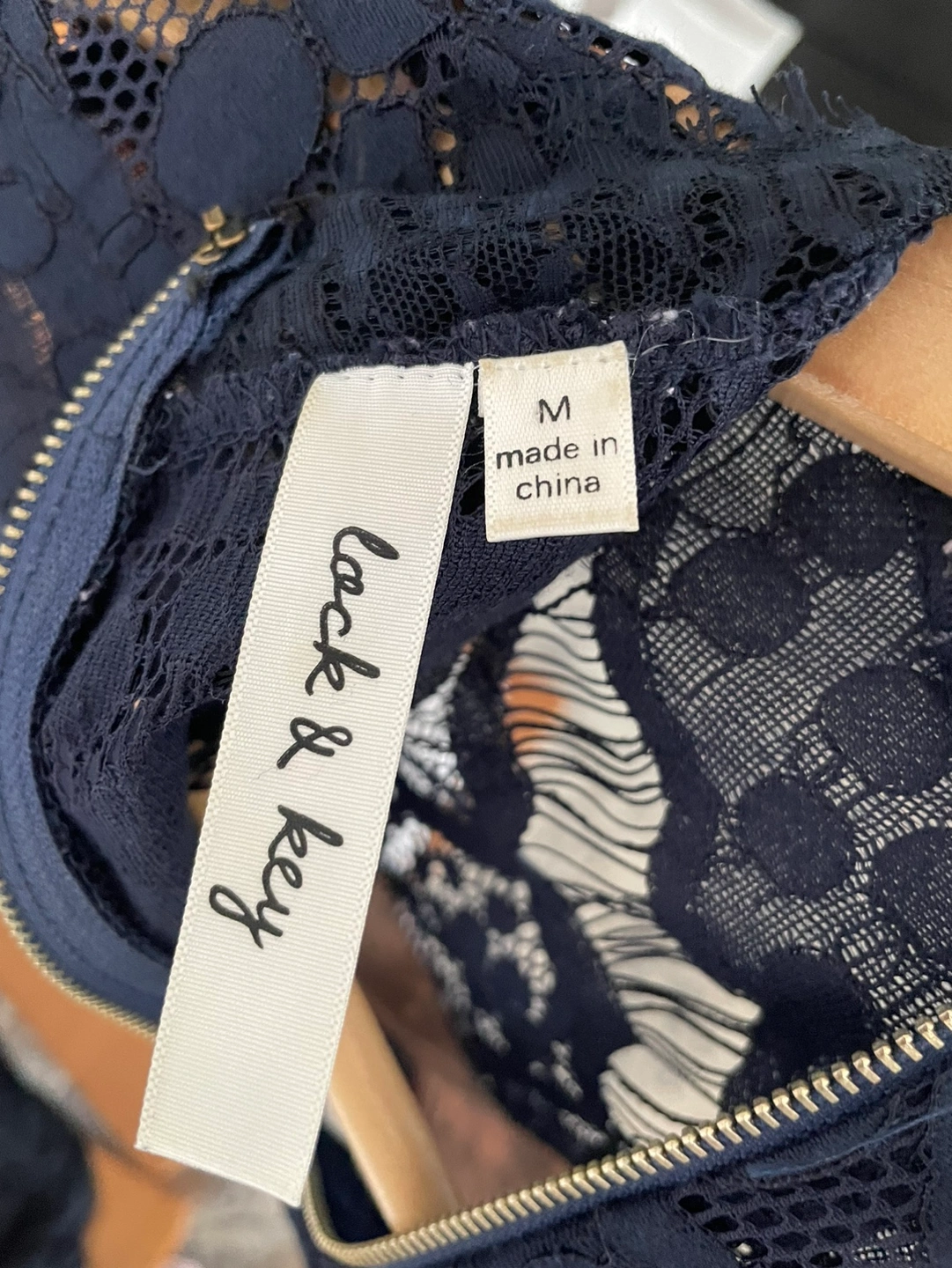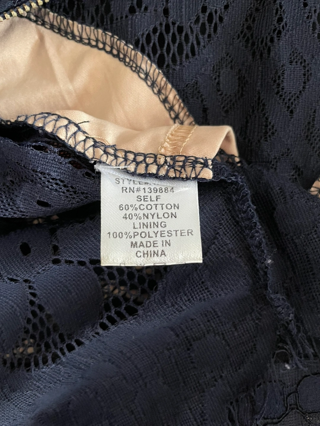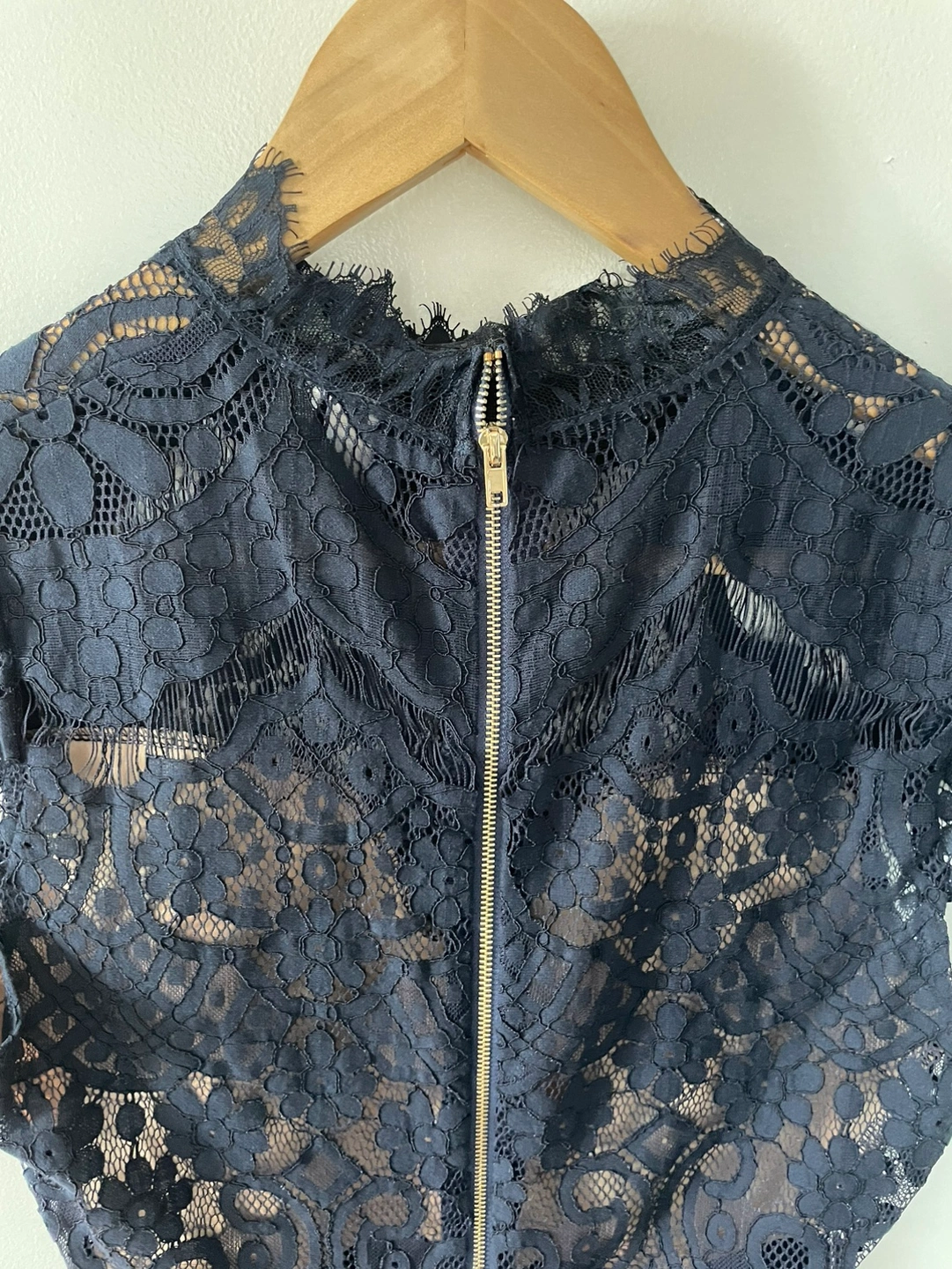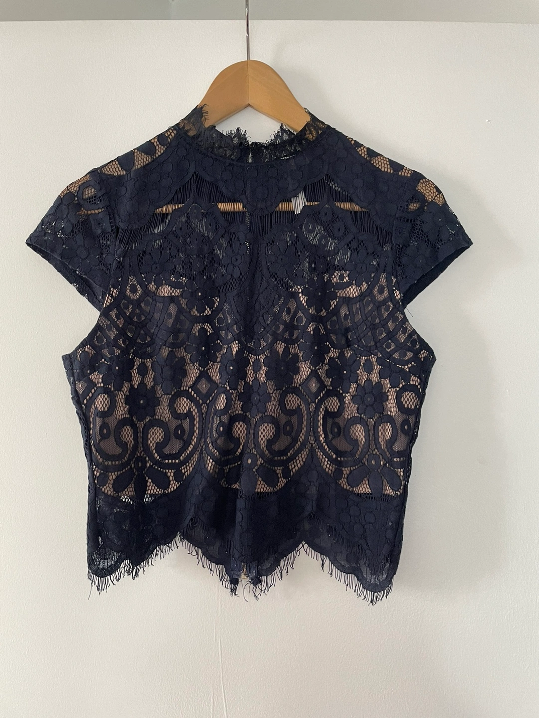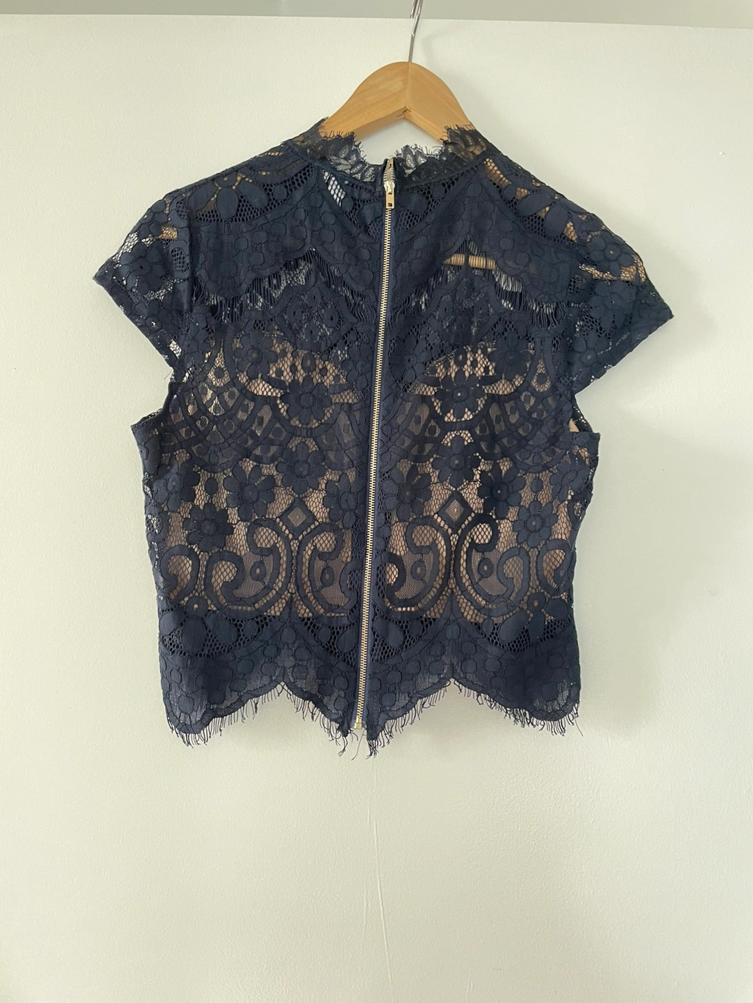 A beautiful navy lace top with short sleeves and a high neckline. This top has a back zipper and is lined with a nude fabric.
