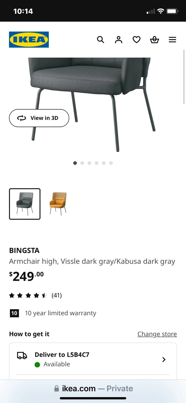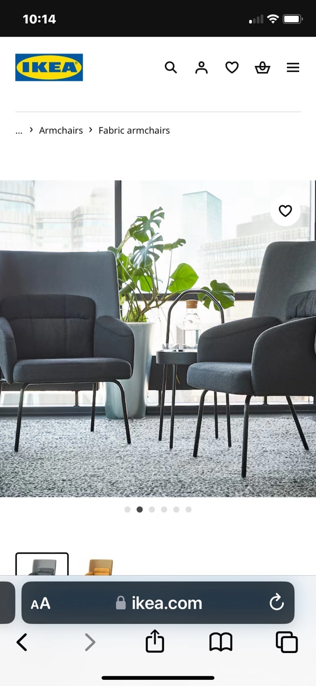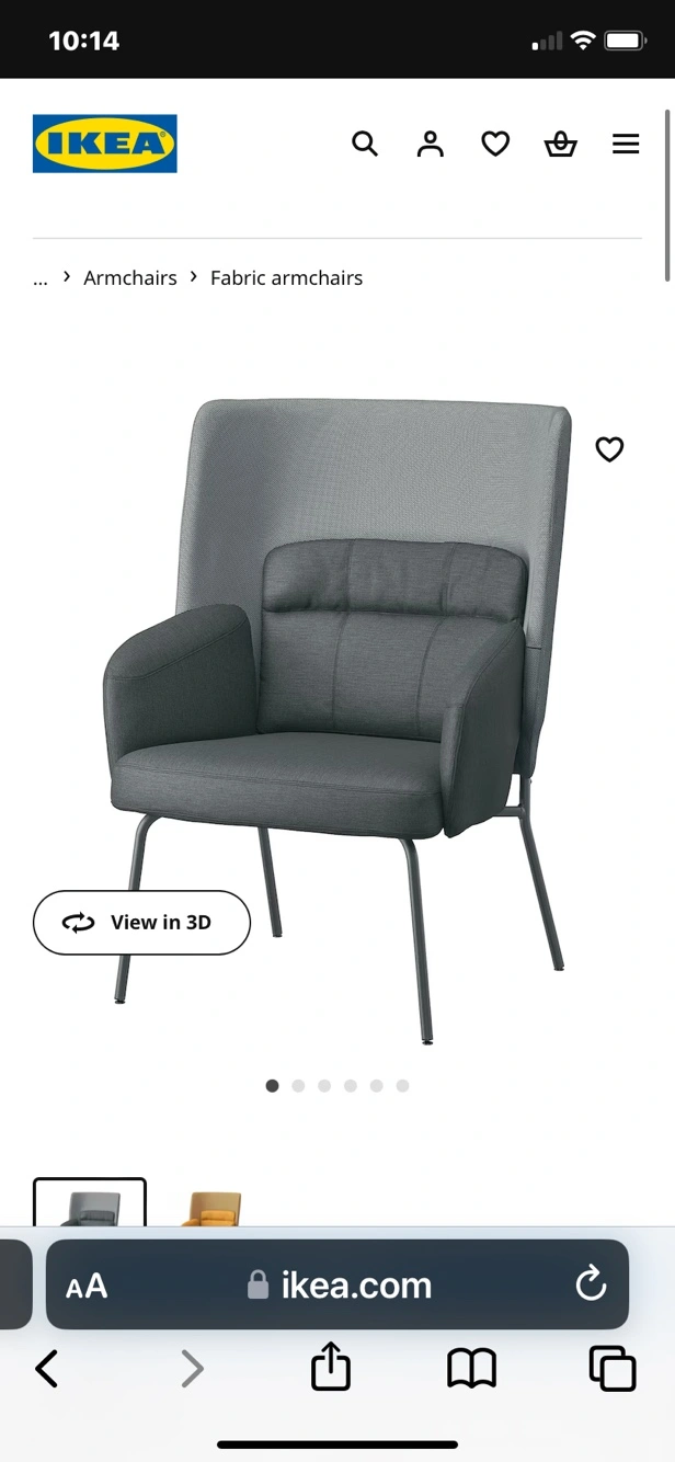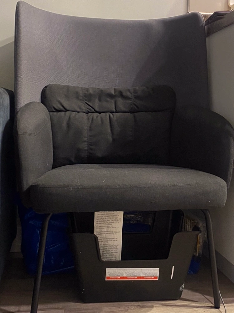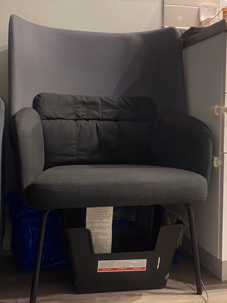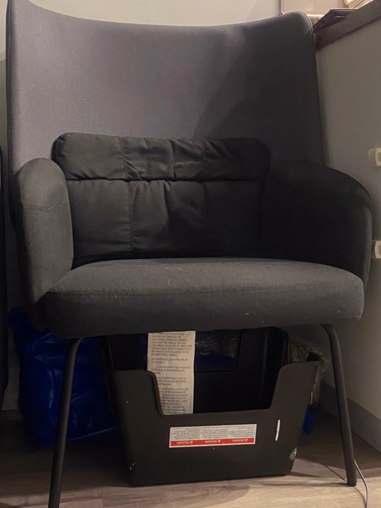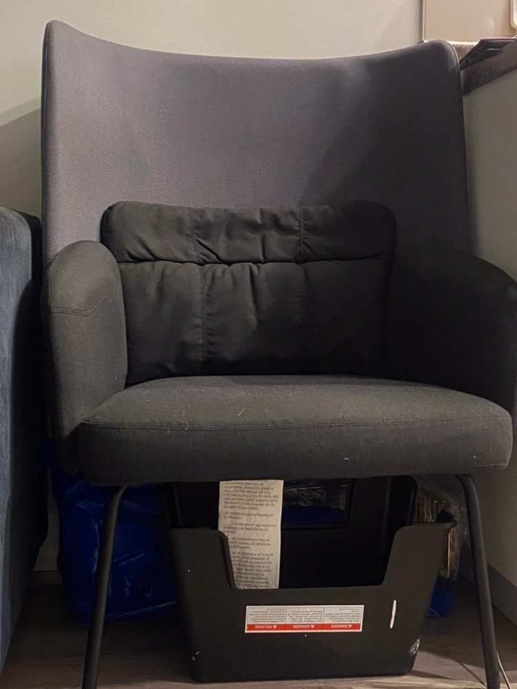 Grey fabric armchair with black metal legs. The chair is in good condition, but may show minor signs of wear. The chair has been used for a few years but is still in great shape. No rips or tears in the fabric. Excellent for adding some style to a living room, bedroom, or office. Need it gone fast as I’m moving please only serious people.
