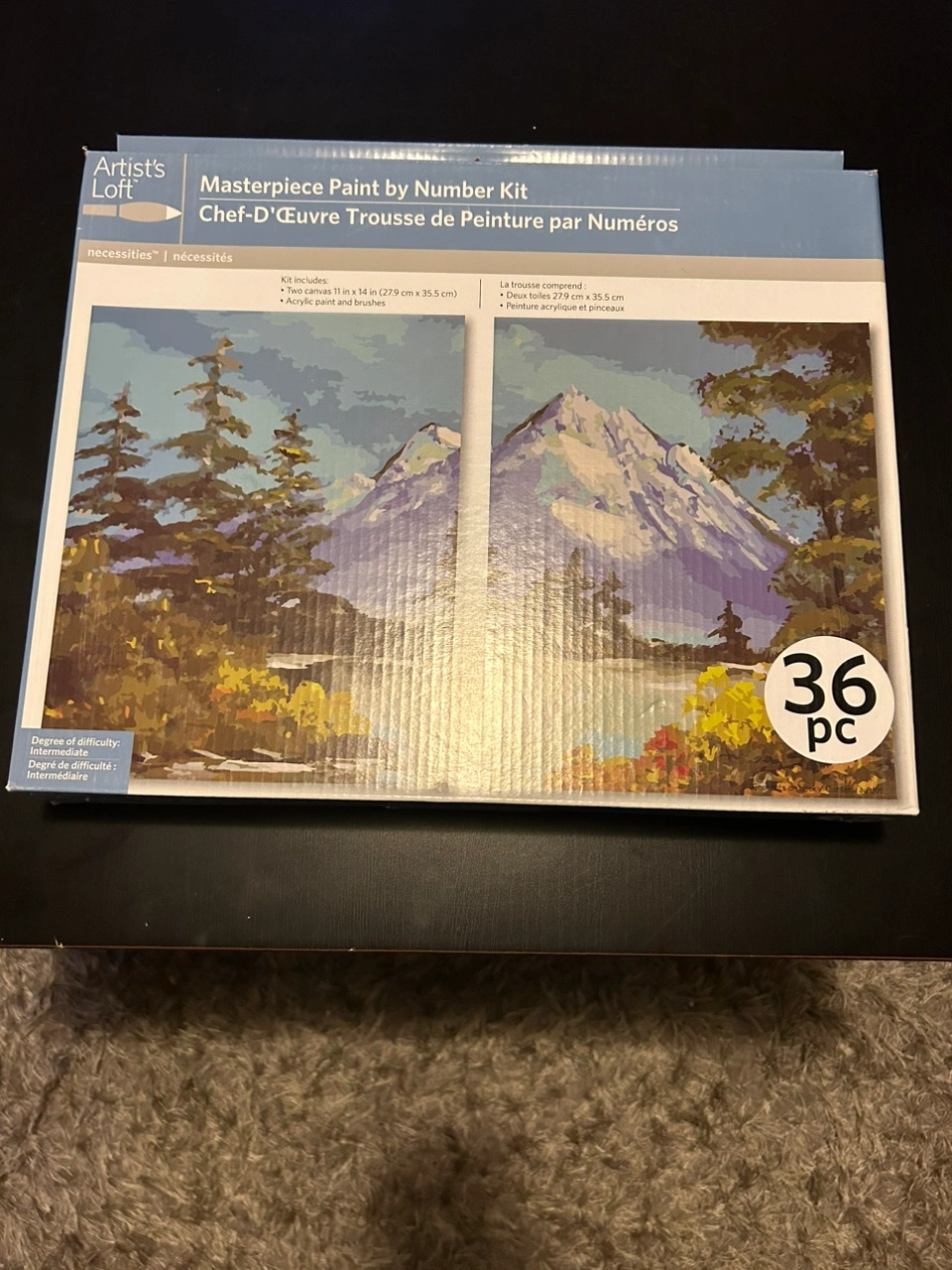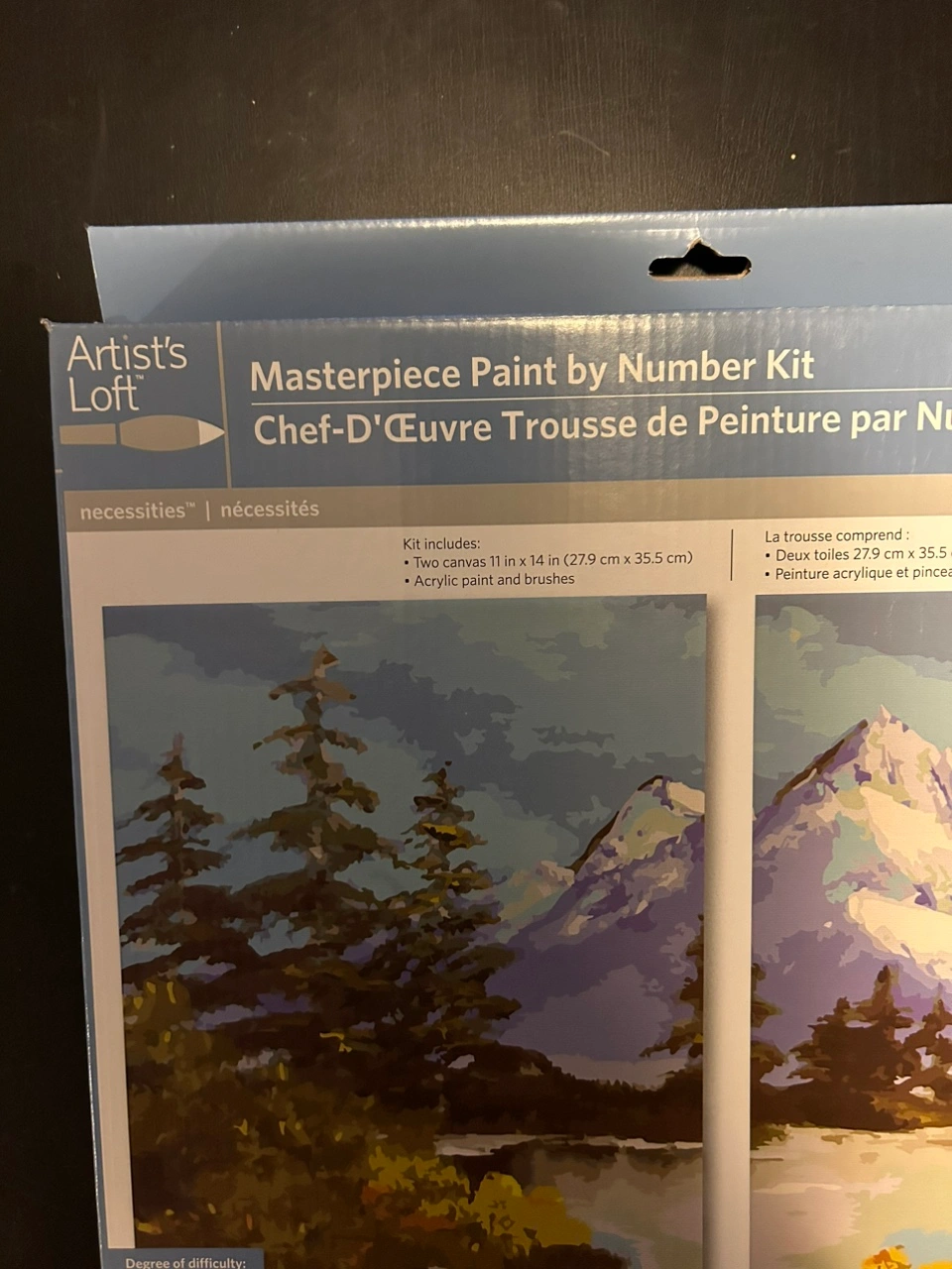 Two canvases, acrylic paint, and brushes are included in this kit to create two mountain landscape paintings.