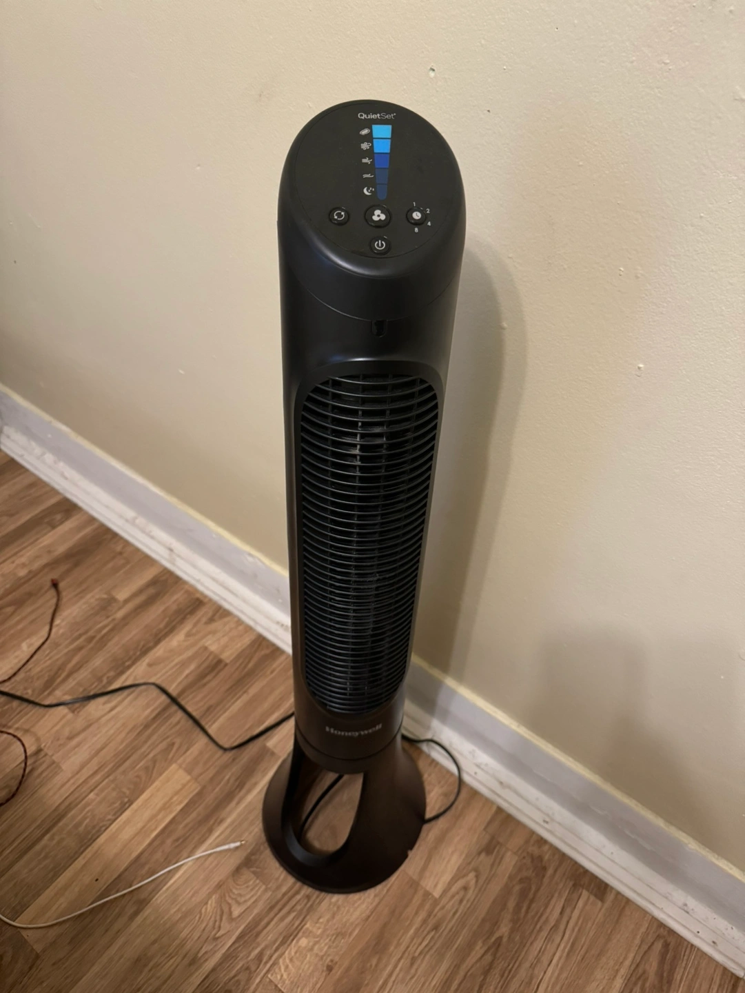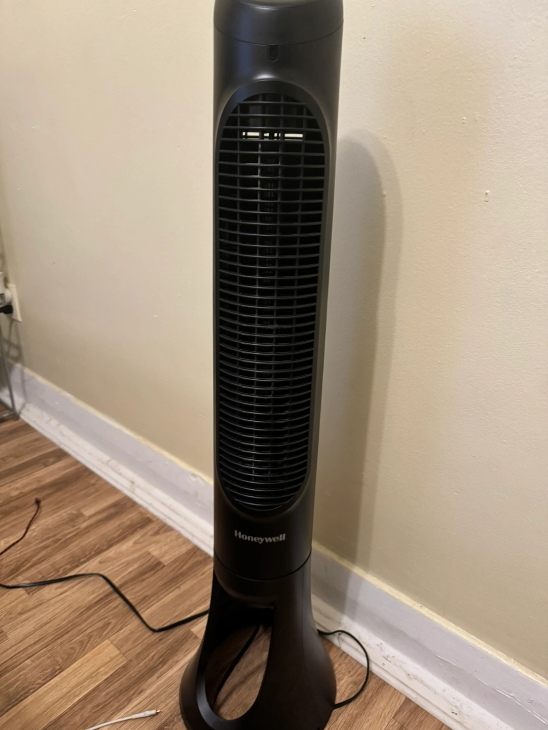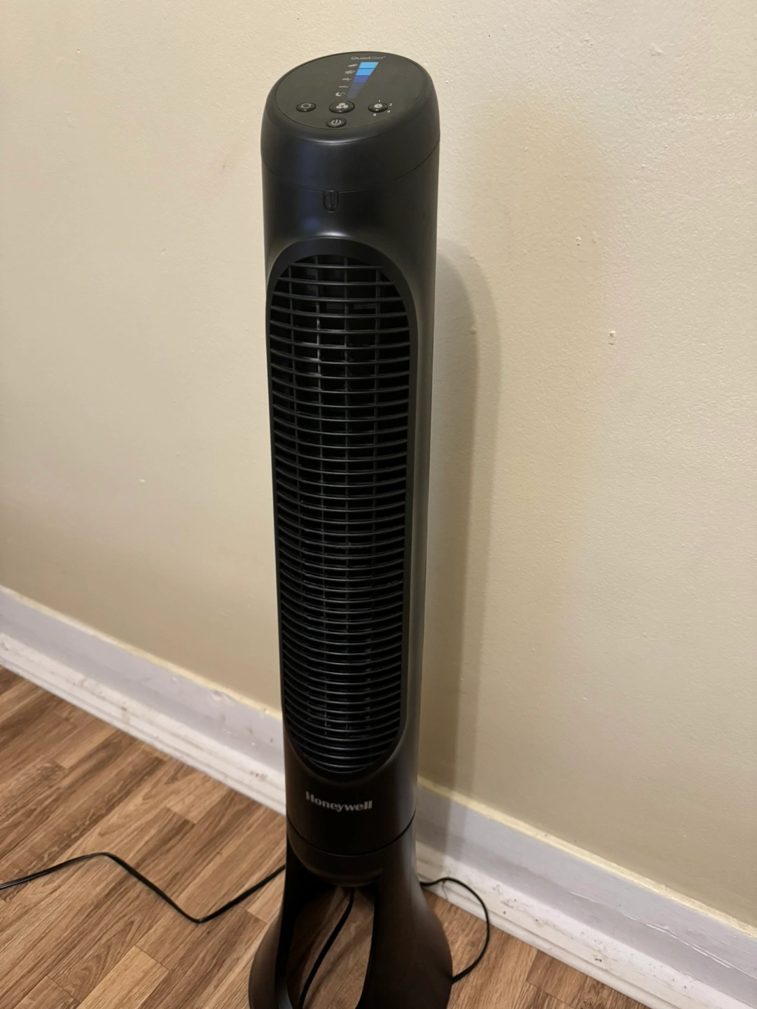 This tower fan has multiple speed settings and an oscillating feature. It is in good working condition and includes the power cord. The fan is black with a digital display. It is taller than 30 inches.