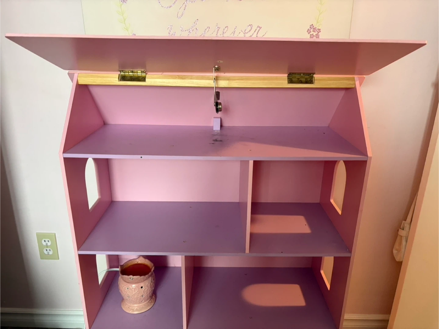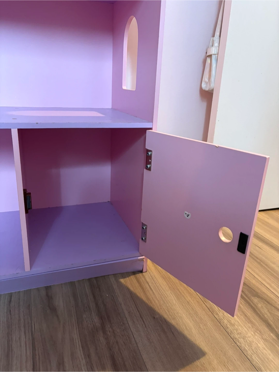 Cute storage with several compartments and a door that opens and closes. Top has hidden compartment. It's in good condition and ready for a new home for imaginative play.
