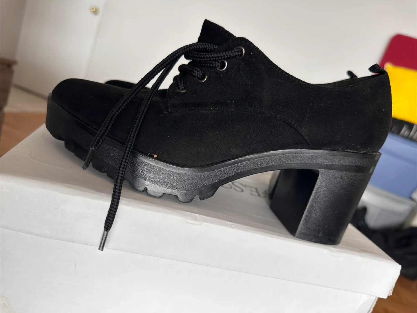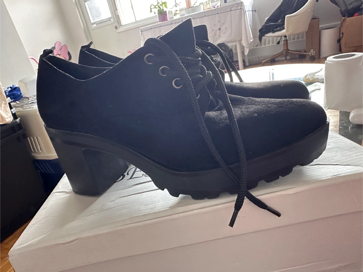These black lace-up shoes feature a chunky block heel and platform sole. They're made from a faux suede material. These shoes would be great for adding a bit of edge to an outfit!