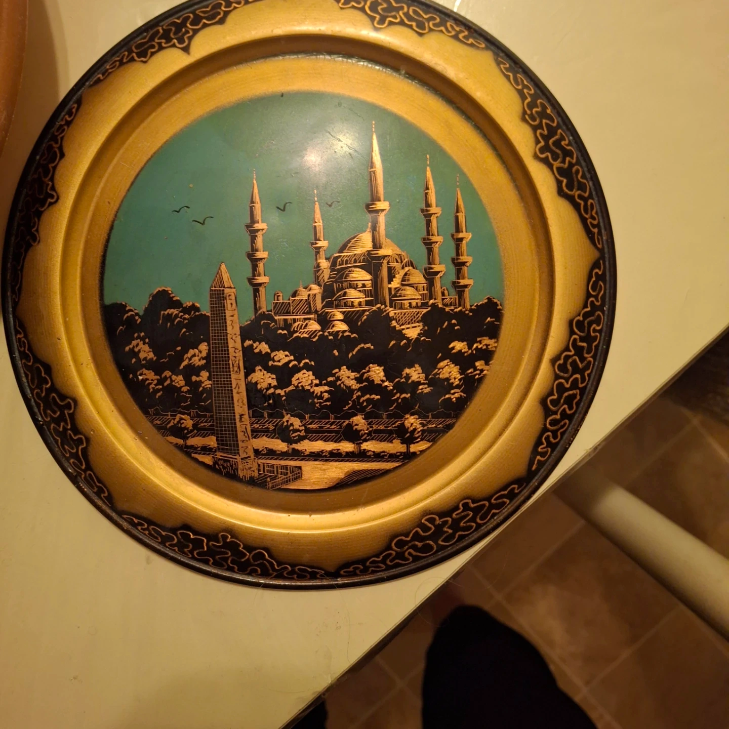 This is a decorative metal piece eaturing a scenic design of a mosque and a tower. The tray has a circular shape with an ornate border. It's made of metal and has a coppery finish on the back.