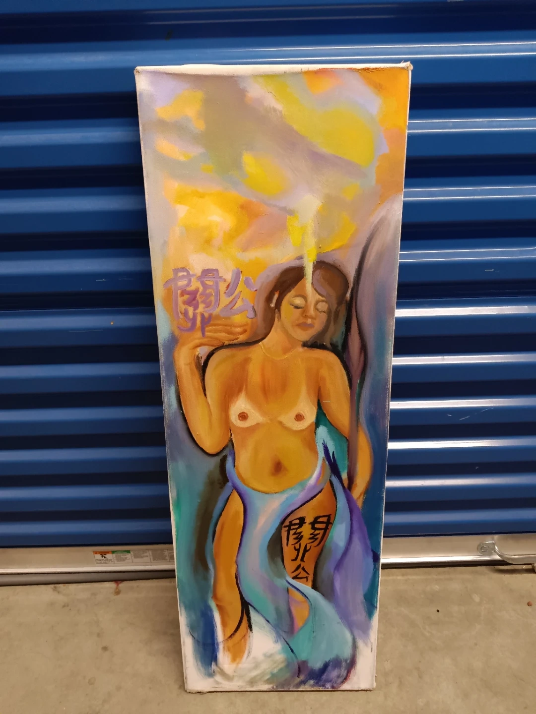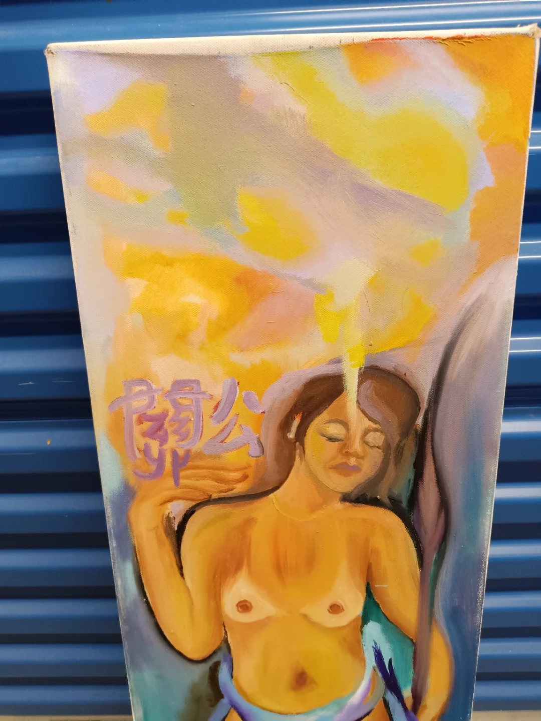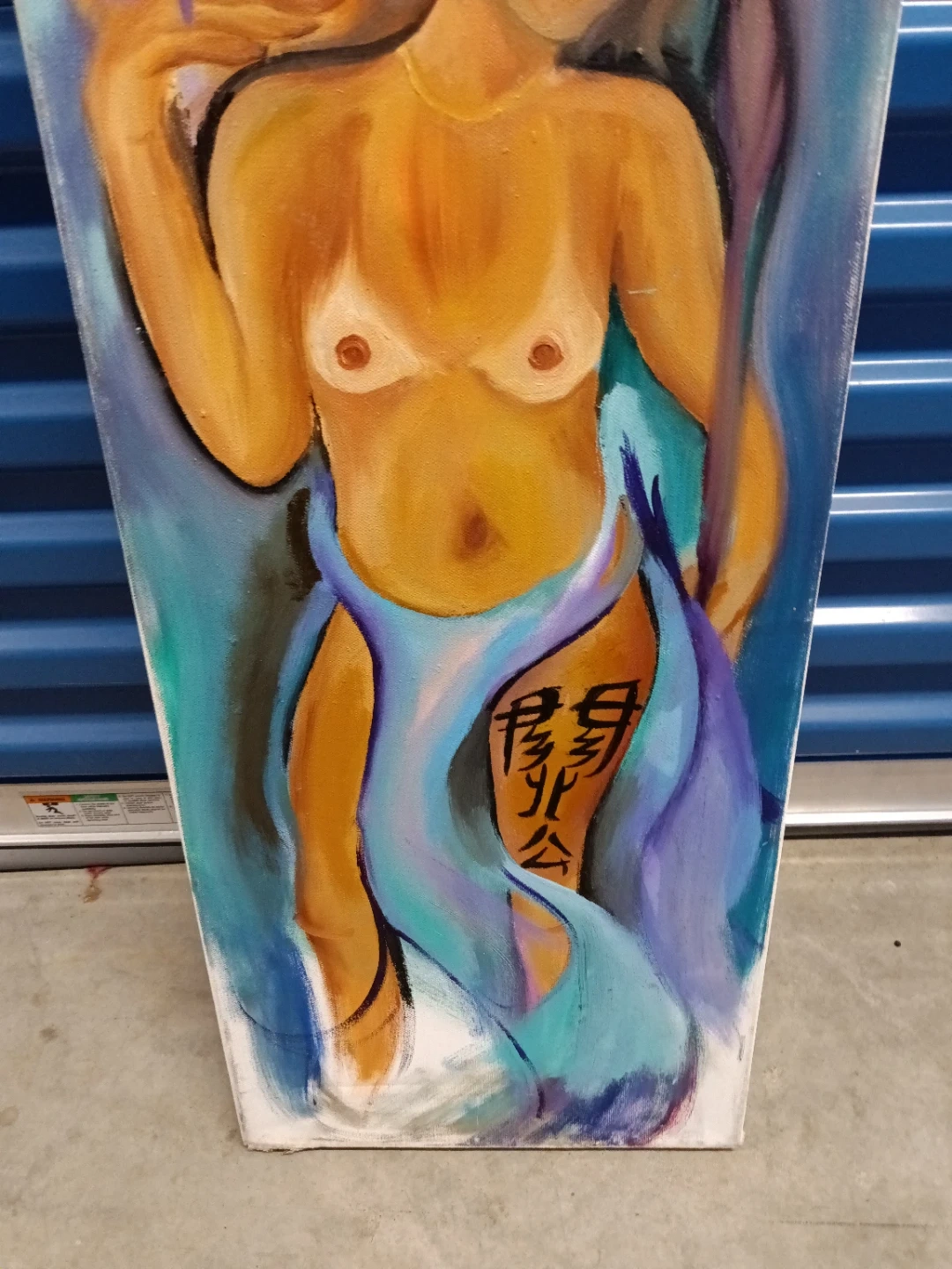 An original oil painting featuring a woman with vibrant colors and Asian calligraphy. This piece displays a unique artistic style. It's a striking addition to any art collection.