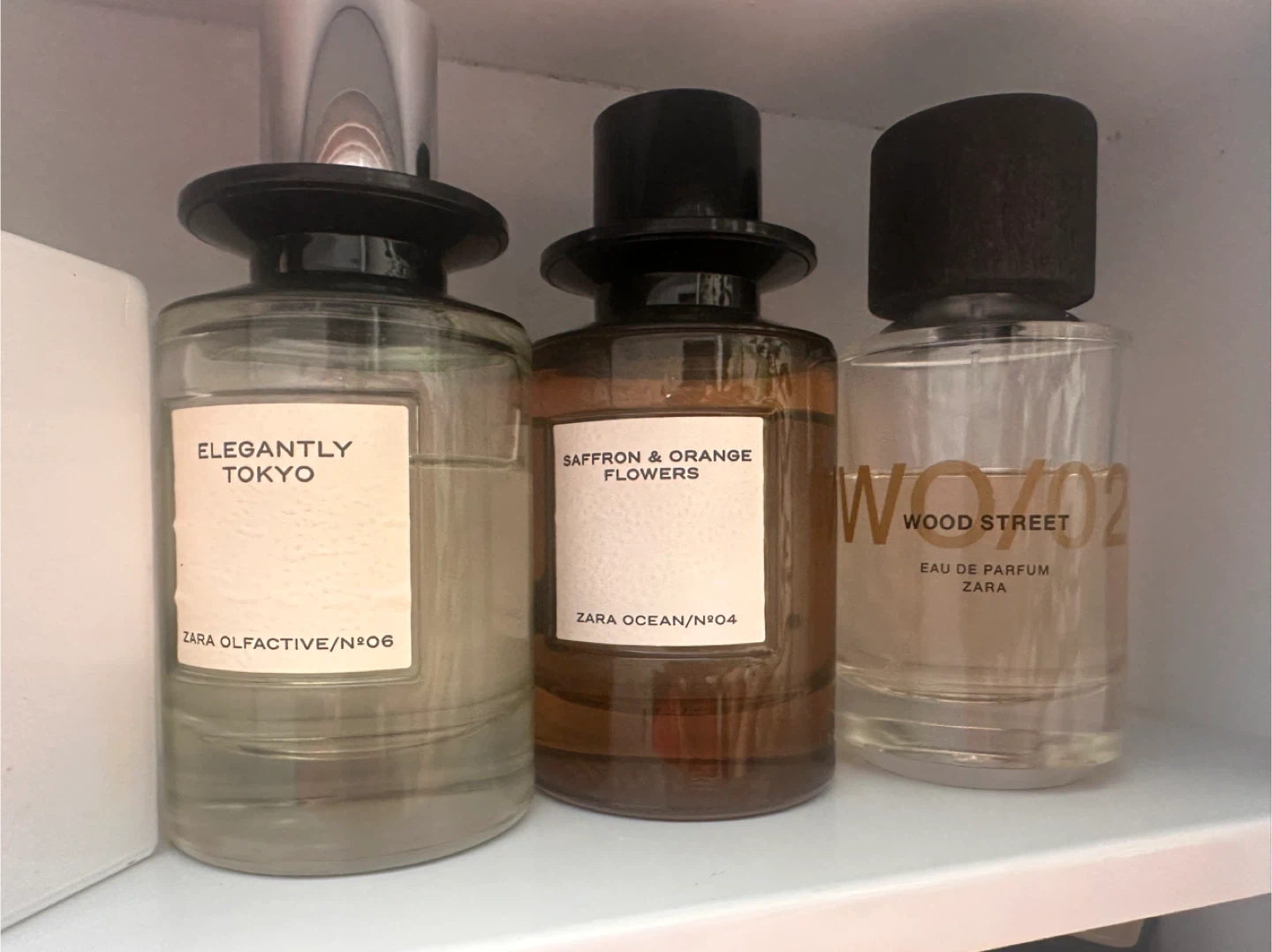 Three Zara fragrances: Elegantly Tokyo, Saffron & Orange Flowers, and WO/02 Wood Street. Each bottle is an Eau de Parfum. These scents are suitable for day wear and offer strong longevity.