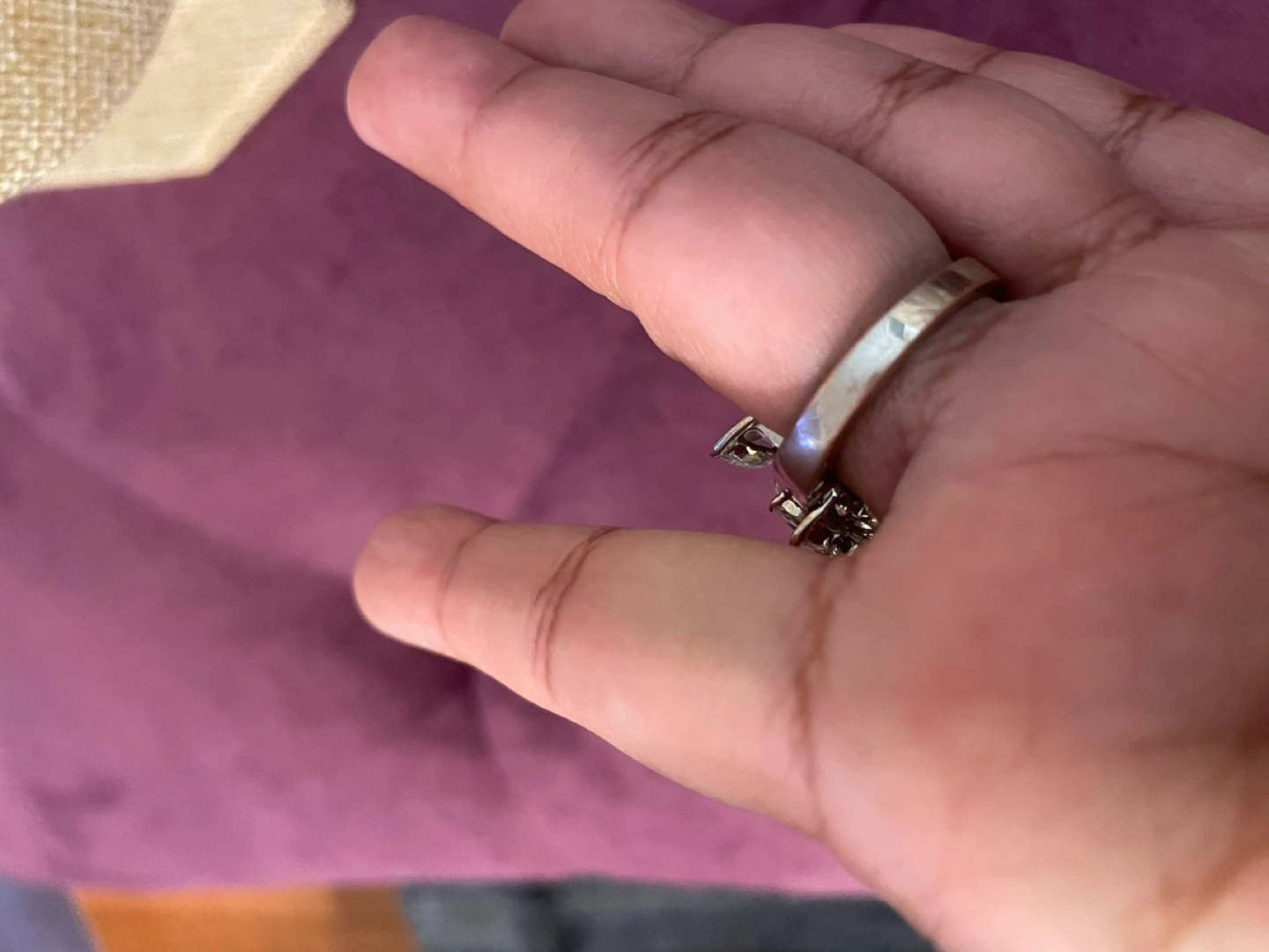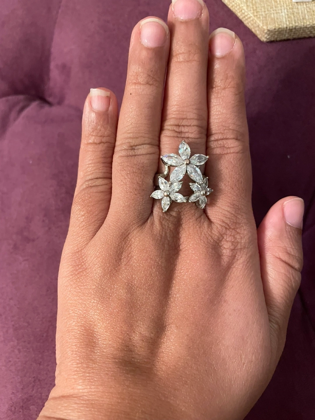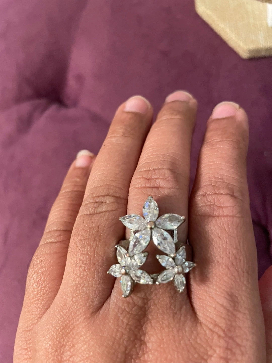 Beautiful silver ring. Features three flower designs, each adorned with sparkling cubic zirconia stones. Elegant and eye-catching statement piece.